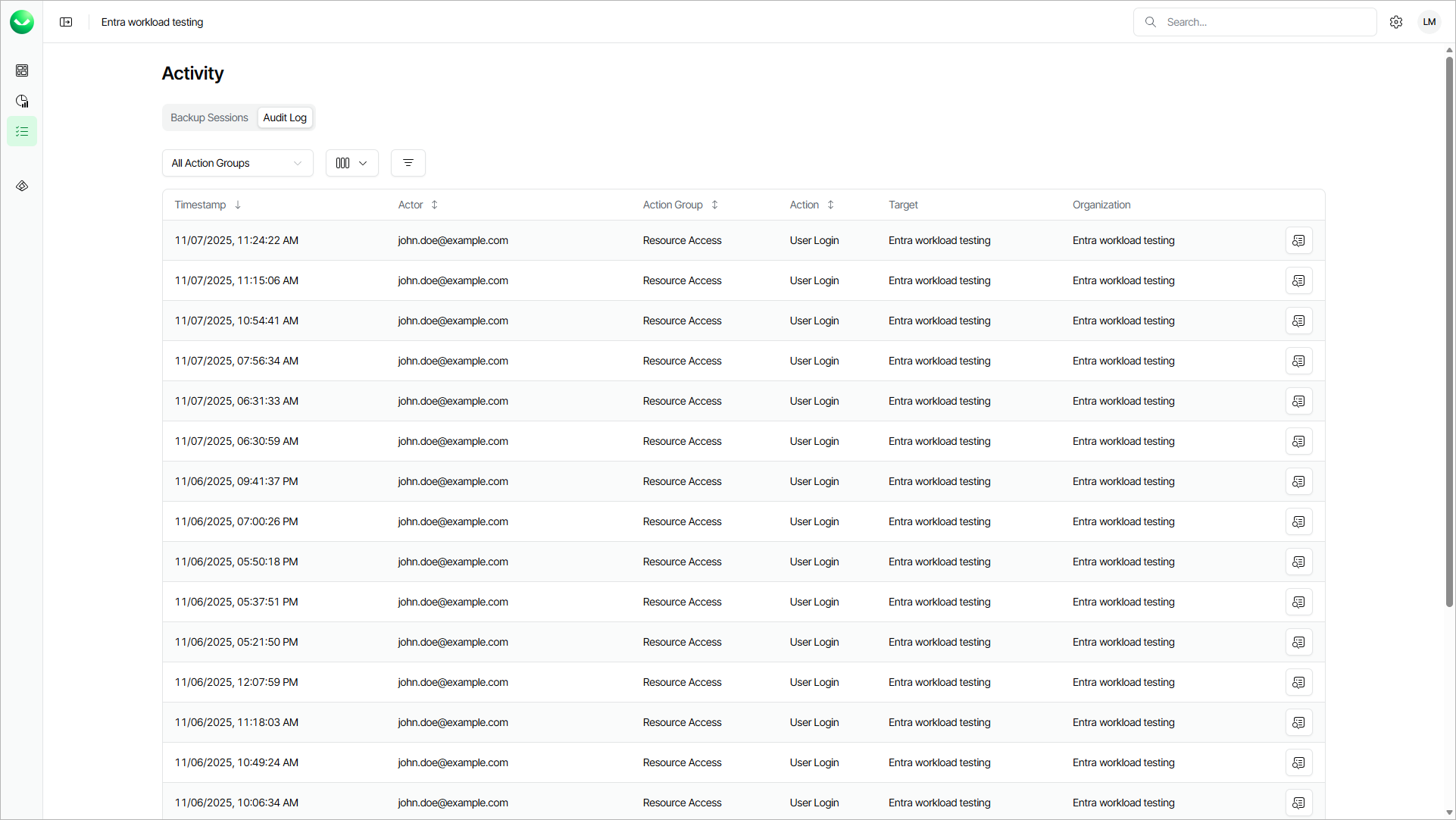 Veeam Data Cloud records all security-sensitive events and creates an audit log. In the Activity view, you can review a unified list of audit log events across all workloads within the Veeam Data Cloud organizations of your customers. This helps you monitor security-sensitive activities and verify whether they comply with your security policies. The Activity view includes all events related to access management and resource access. For details, see Audit Log Events.