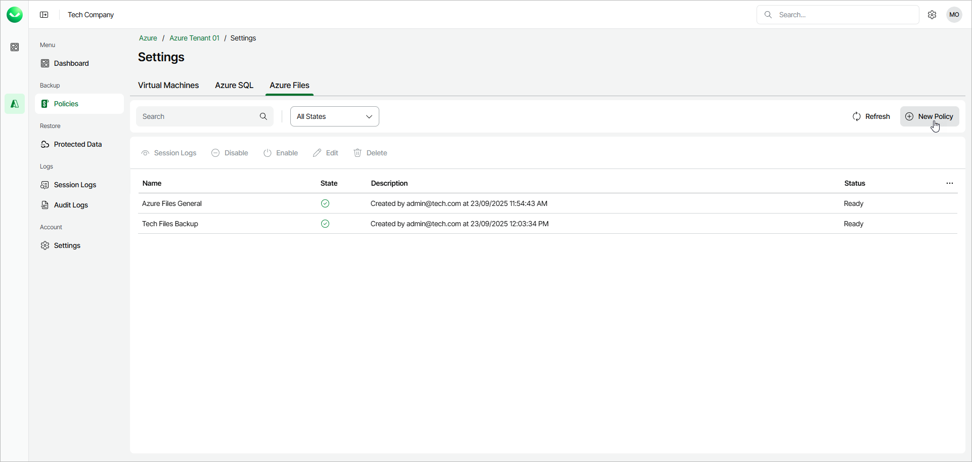 Step 1. Launch New Azure Files Policy Wizard To launch the New Azure File Policy wizard, do the following:In the Backup section of the main menu, select Policies.Select the Azure Files tab and click New Policy.