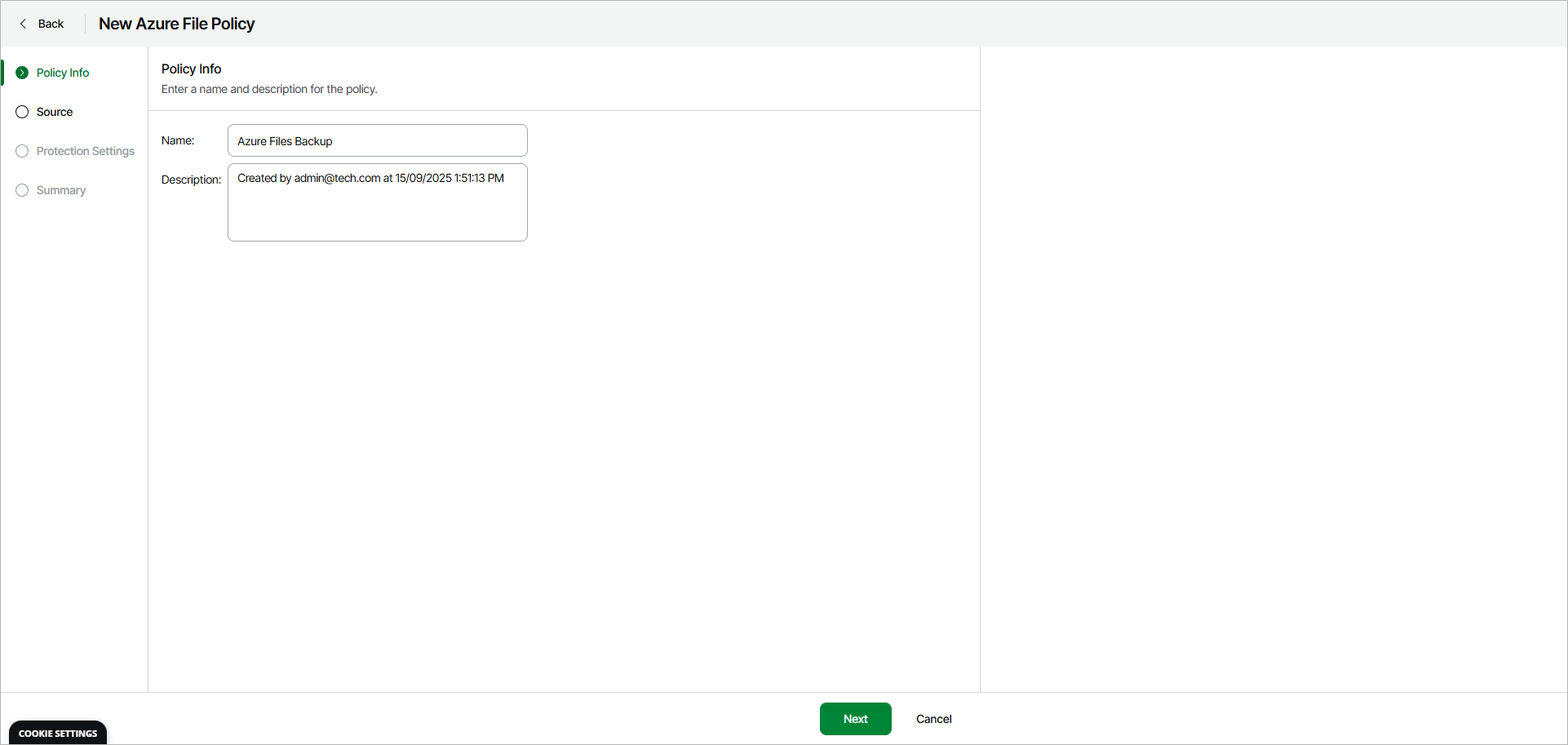 At the Policy Info step of the wizard, specify a name and settings for the backup policy.