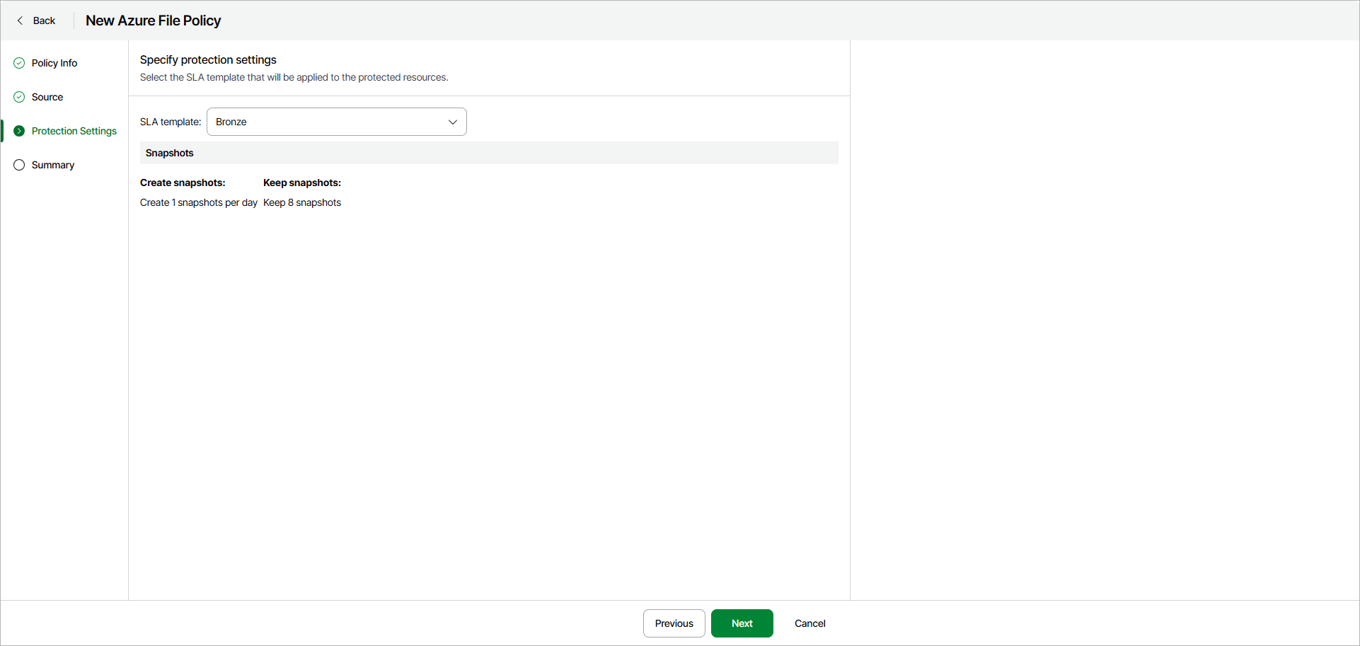 At the Protection Settings step of the wizard, select an SLA template that will be applied to the protected resources: