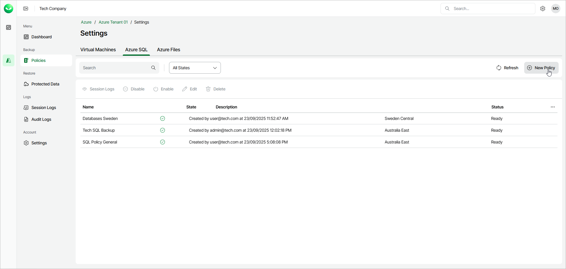 Step 1. Launch New Azure SQL Policy Wizard To launch the New Azure SQL Policy wizard, do the following:In the Backup section of the main menu, select Policies.Select the Azure SQL tab and click New Policy.