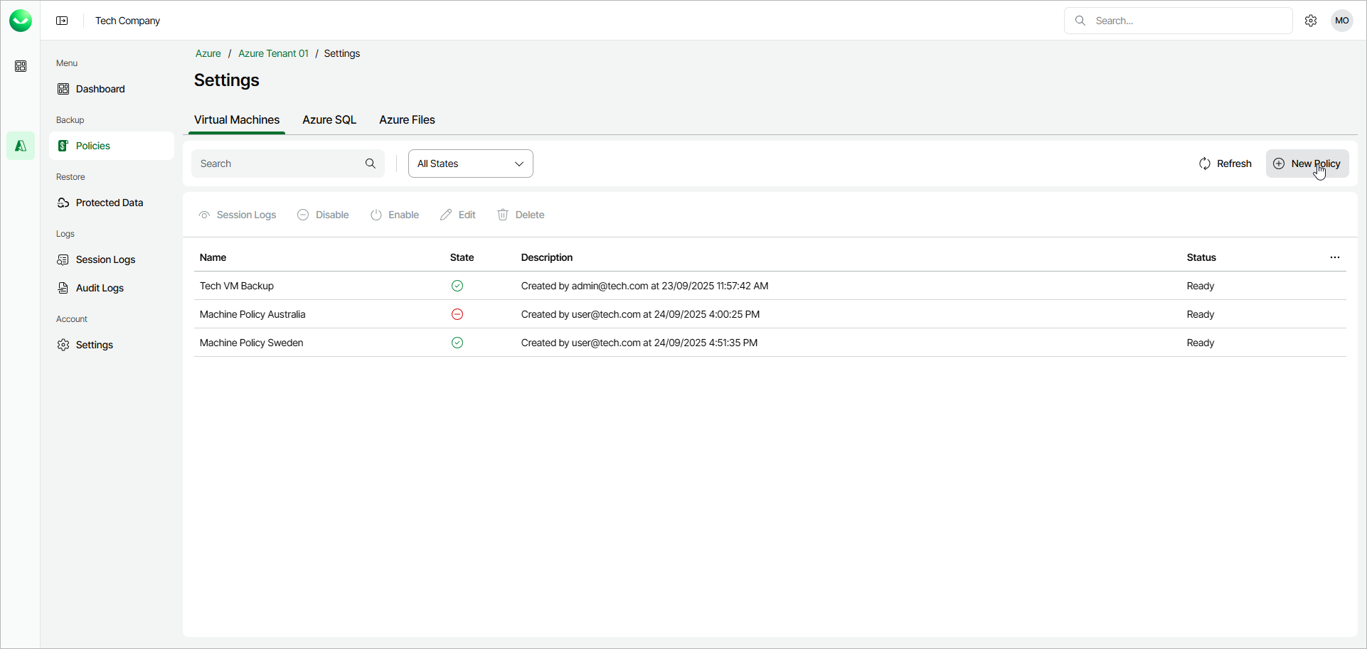 Step 1. Launch New Azure Virtual Machine Policy Wizard To launch the New Azure Virtual Machines Policy wizard, do the following:In the Backup section of the main menu, select Policies.Select the Virtual Machines tab and click New Policy.