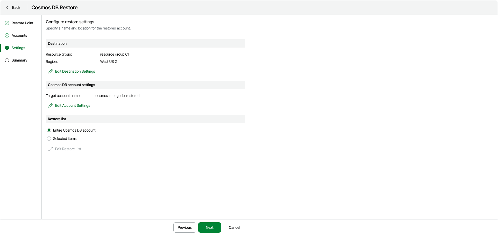 - In the Destination section, click Edit Destination Settings to select a resource group and an Azure region to which the account will be restored.
