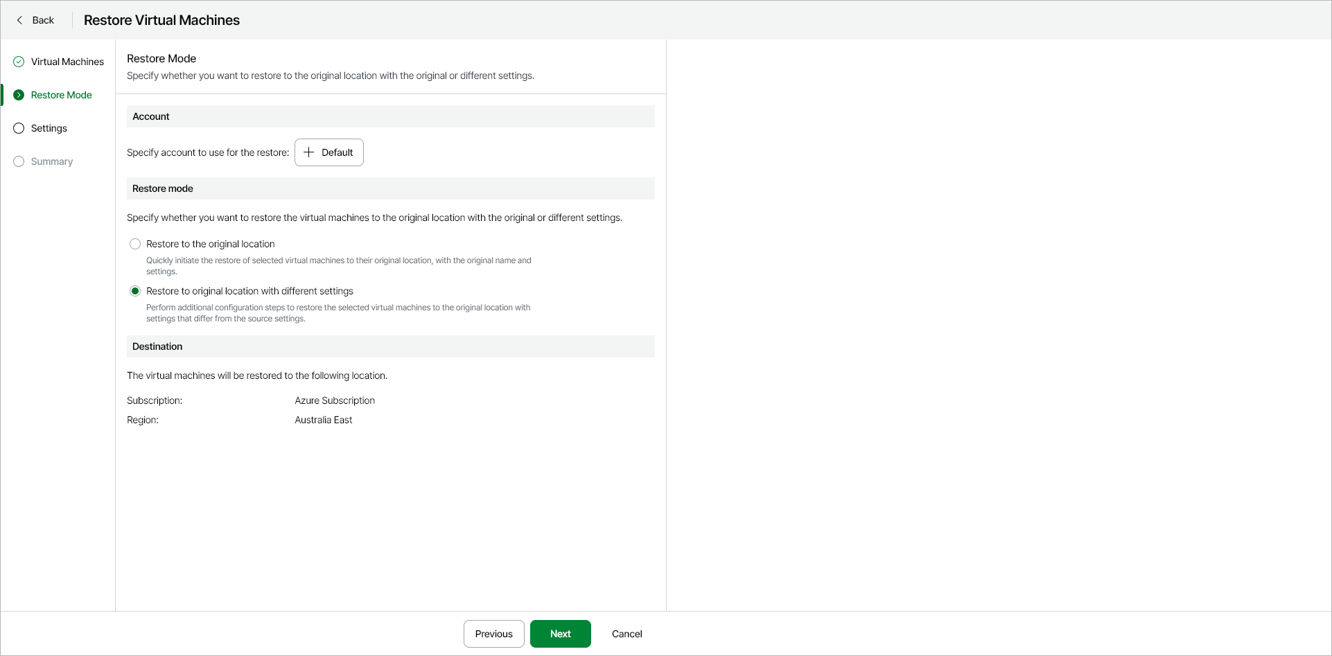 At the Restore Mode step of the wizard, specify the following restore settings: