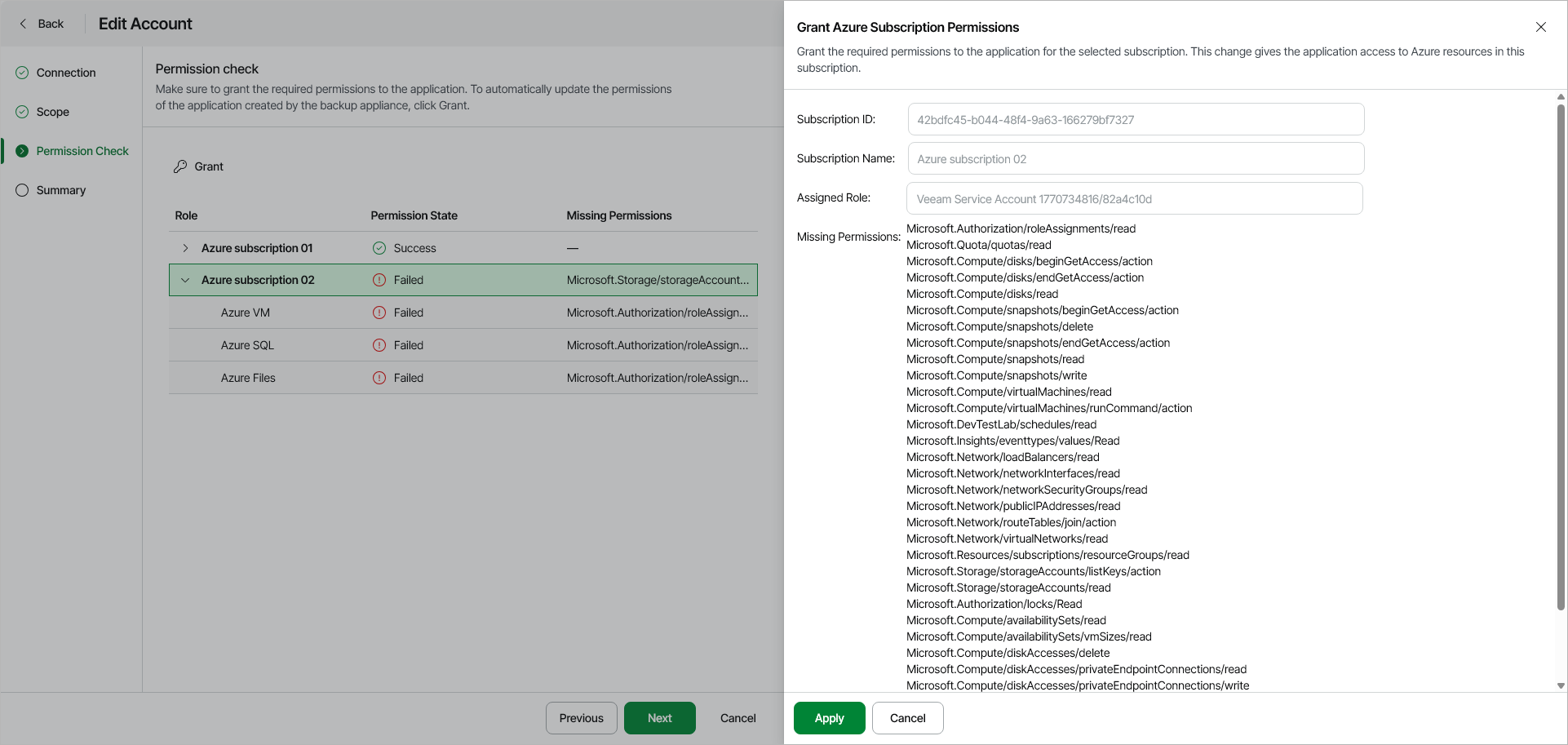 - At the Permission Check step of the wizard, ensure that Veeam Data Cloud for Microsoft Azure has all necessary permissions to protect the subscription resources. To do this, perform the following steps: