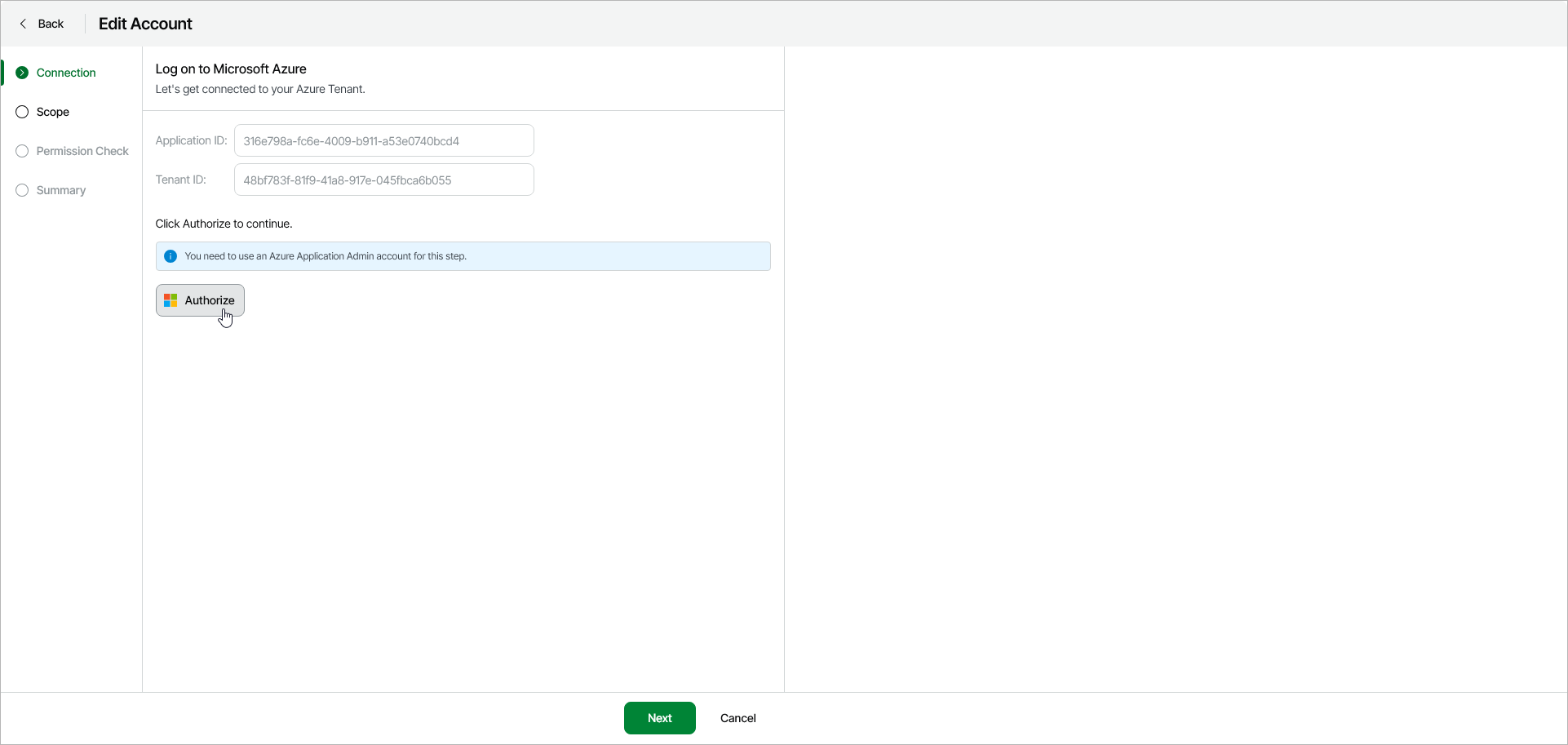 - At the Connection step of the wizard, you must allow Veeam Data Cloud for Microsoft Azure to access your Azure tenant. To do this, click Authorize and log in to your Microsoft account.