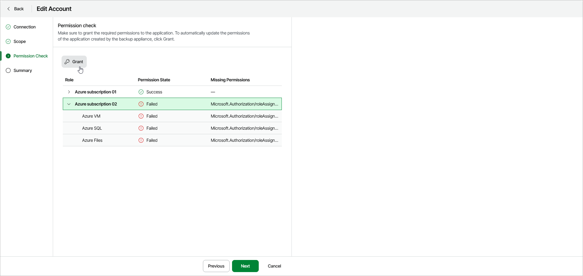 - Select the subscription for which you want to grant the missing permissions to Veeam Data Cloud, and click Grant.