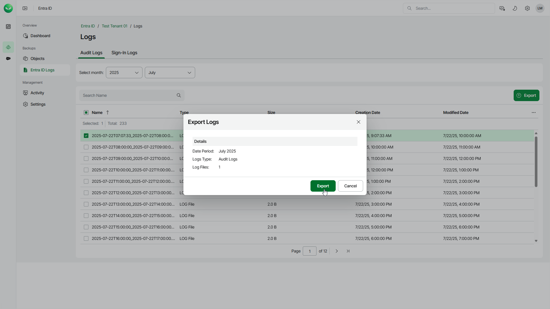 - In the Export Logs window, click Export to start the restore session. Veeam Data Cloud will create a SAS link once the log files are exported and ready to download. You will receive an email notification once the export is completed successfully or fails.