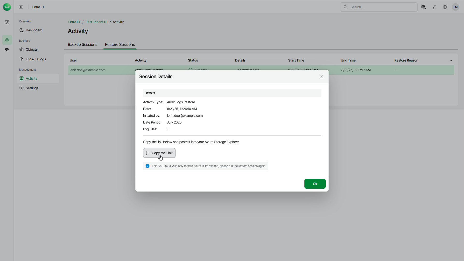 The SAS link is valid for 2 hours. When the link expires, start a new restore session.