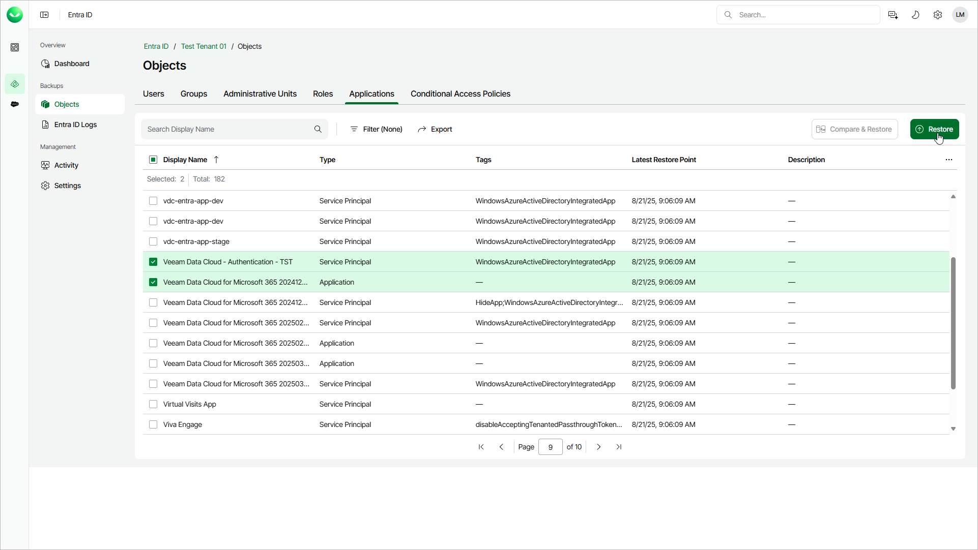 [Entire restore of permanently deleted and linked applications and service principals] You can restore a service principal that represents an application only together with this application and within one restore session. If you restore the application in a separate restore session, the restored application gets a new AppID. The service principal will not recognize this new ID, and the restore of the service principal will fail. |