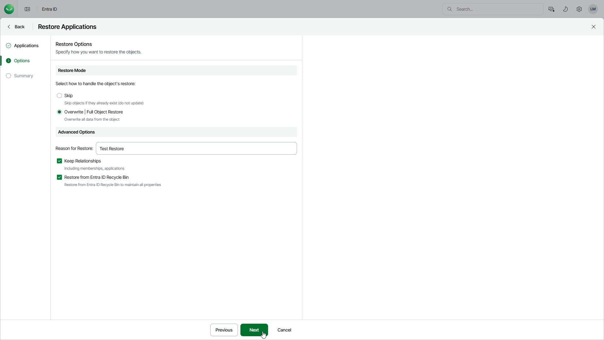At the Options step of the wizard, configure the restore options, such as how to restore applications and service principals, their relationships and other: