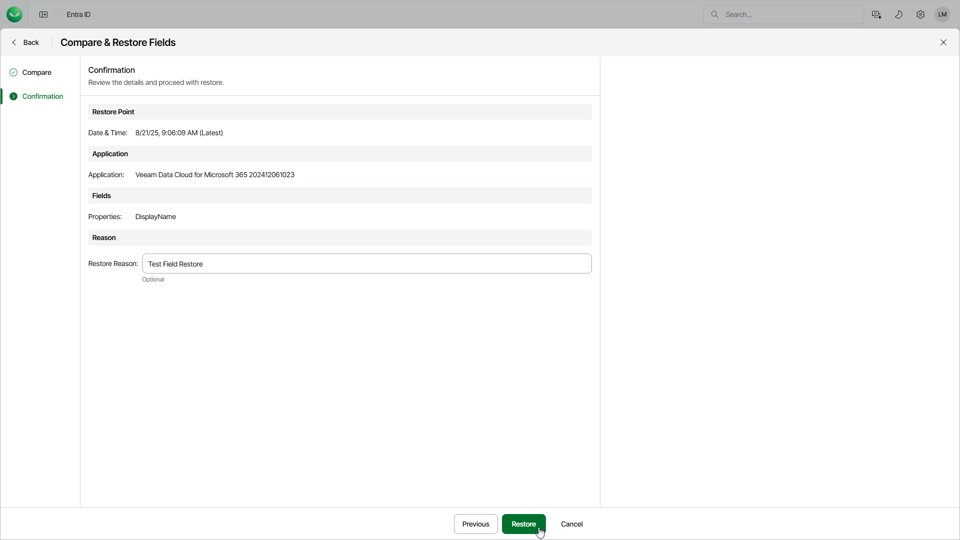 In the Restore Reason field, you can enter a reason for restoring the application. This information will be saved to the session history, and you will be able to reference it later.