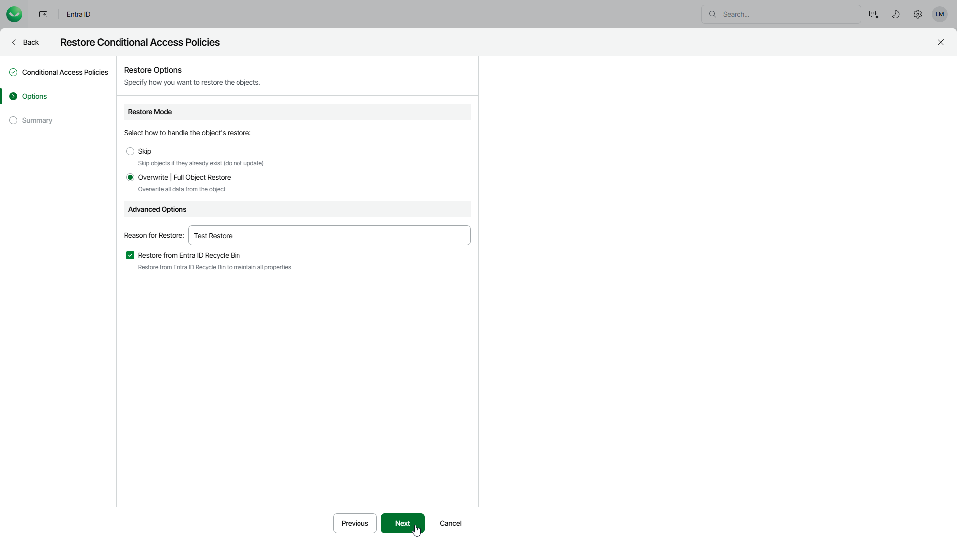 To restore Conditional Access policies that cannot be restored from the recycle bin, launch the restore wizard again, select the necessary Conditional Access policies and clear the Restore from Entra ID Recycle Bin check box. The Conditional Access policies will be restored from the backup and get new object IDs.