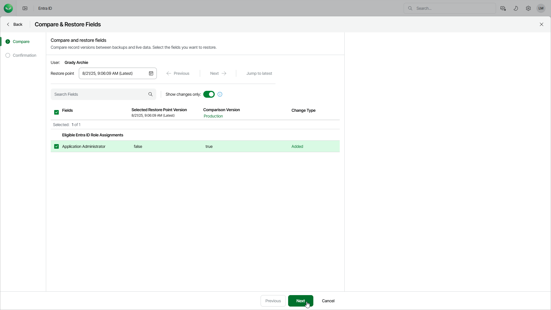 At the Compare step of the wizard, select a restore point and properties that you want to restore. You can compare the property values in the selected restore point with the values in production or in another restore point.