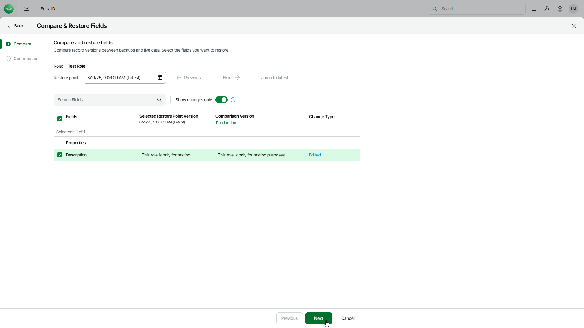 At the Compare step of the wizard, select a restore point and properties that you want to restore. You can compare the property values in the selected restore point with the values in production or in another restore point.