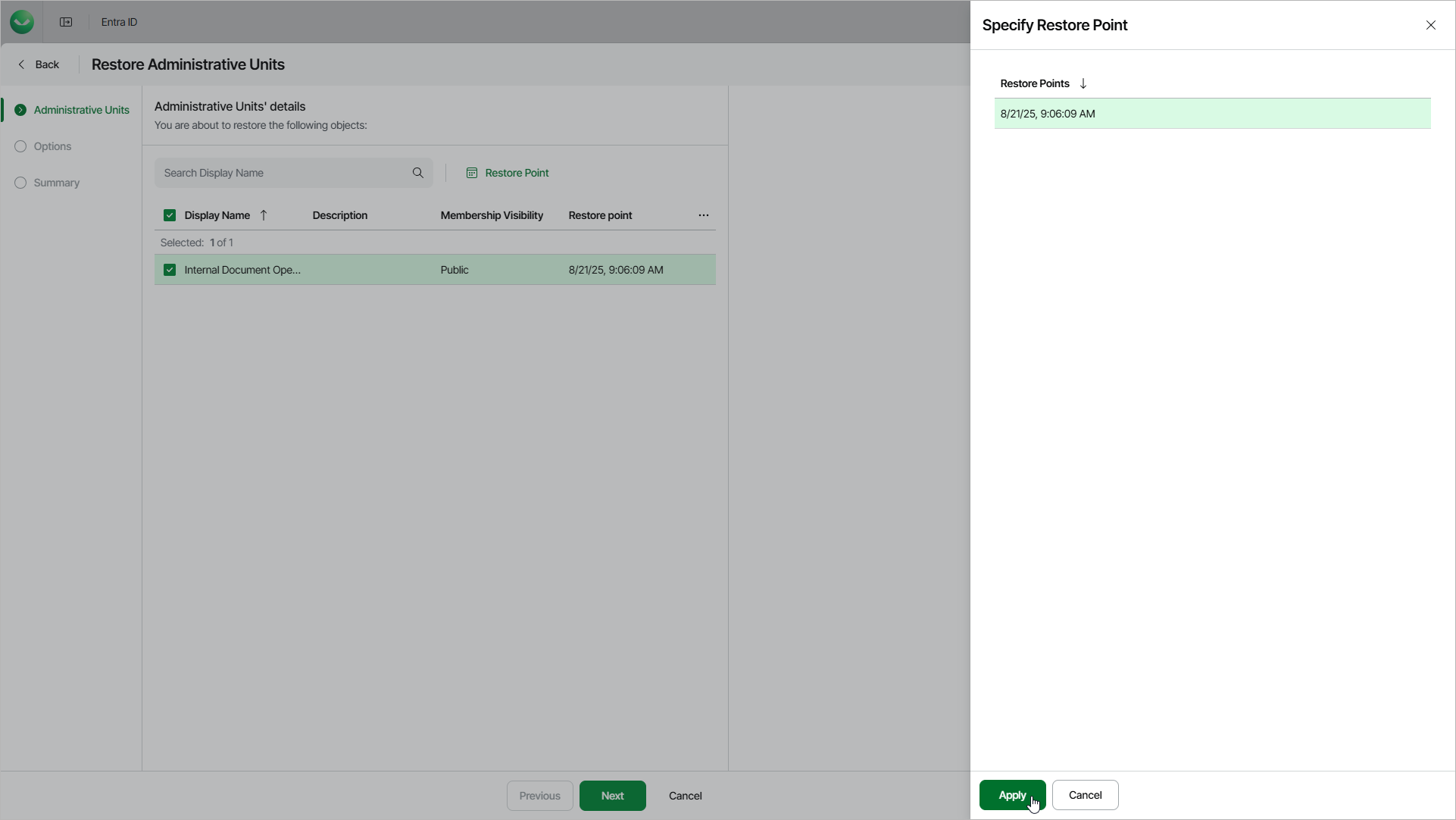 If you select one administrative unit, Veeam Data Cloud shows the restore points available for this unit. If you select multiple units, Veeam Data Cloud shows all available restore points. After you select a restore point, Veeam Data Cloud verifies its availability for each unit.