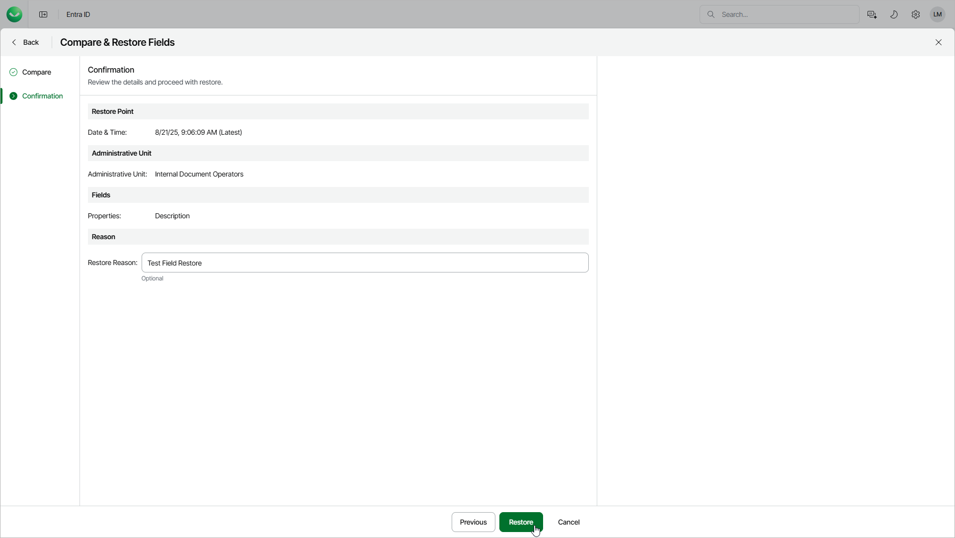 At the Confirmation step of the wizard, review the summary information and click Restore.