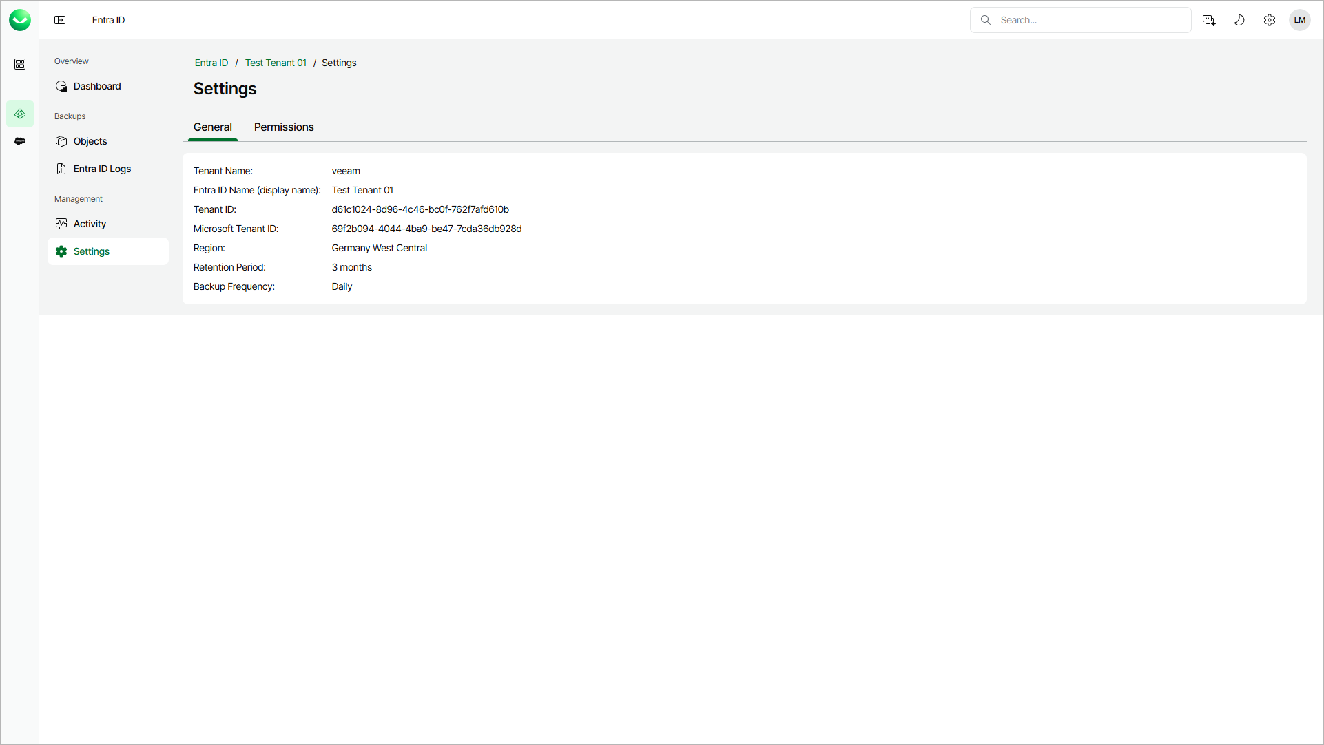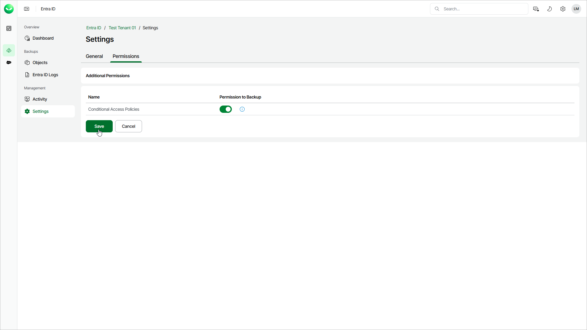 The Veeam Data Cloud portal enables you to review general settings of the tenant and to include Conditional Access policies in your Entra ID backup.