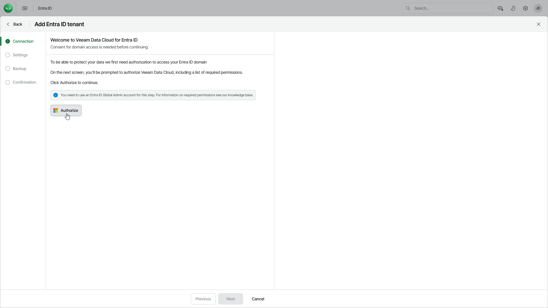 At the Connection step of the wizard, log in to the Microsoft 365 account of your customer to authorize Veeam Data Cloud to access the Microsoft Entra ID tenant of your customer. Before authorization, make sure your Veeam Data Cloud account has permissions that are required for adding, backing up and restoring of the customer tenant. For details, see Permissions.