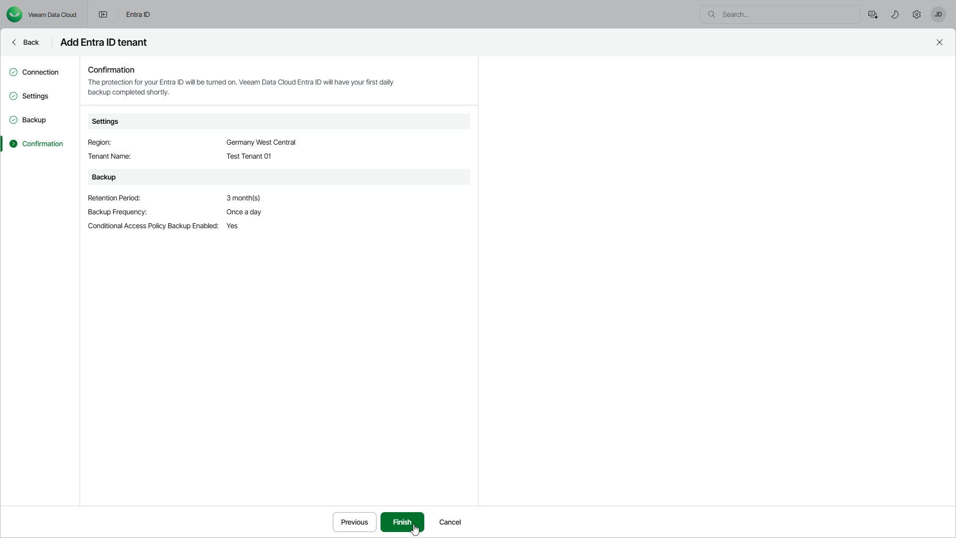 At the Confirmation step of the wizard, review the details of configured settings and click Finish to start provisioning the new tenant. After the infrastructure for your tenant is ready, Veeam Data Cloud will create the initial backup of your Microsoft Entra ID tenant. You will receive an email notification once the initial backup of Entra ID objects and Entra ID log is completed.