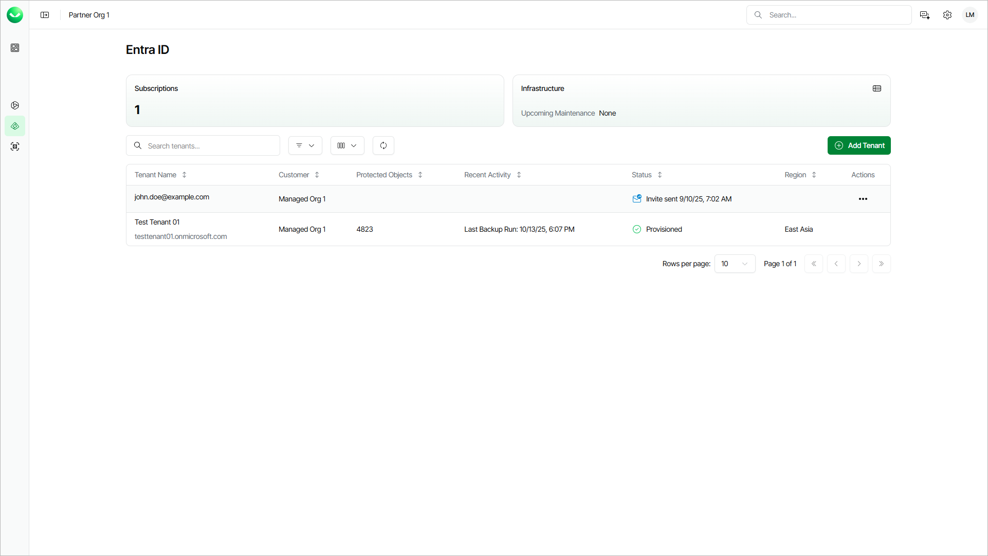 Tenant Name | Name that you specified when adding the tenant and the primary domain name of the Microsoft Entra ID tenant that this Veeam Data Cloud for Microsoft Entra ID tenant is connected to. If the tenant status is Invite Sent, this property shows the email address to which you sent the invitation. |