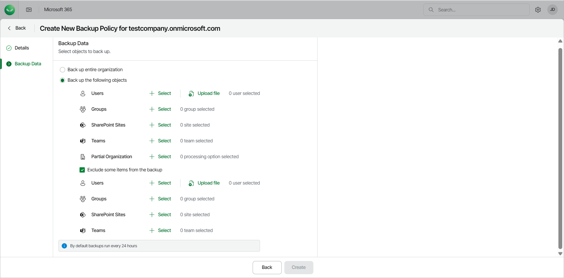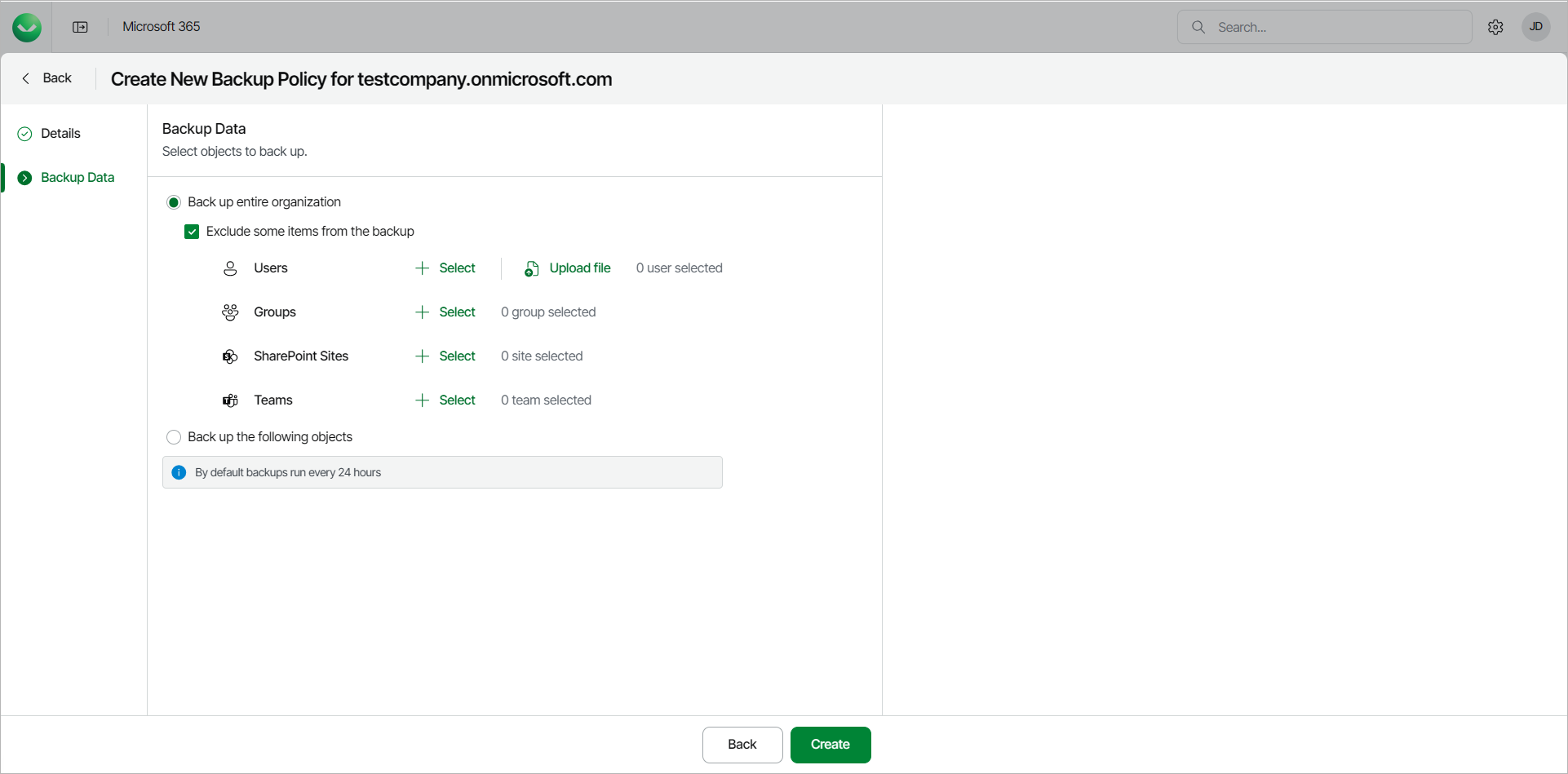 - Select Back up entire organization to back up all objects within your Microsoft organization. When the backup policy runs, it will back up the entire content of the organization and the list of items to back up will be automatically updated. For example, if some mailboxes were added or deleted from the organization between backup policy runs, the backup policy will reflect those changes.