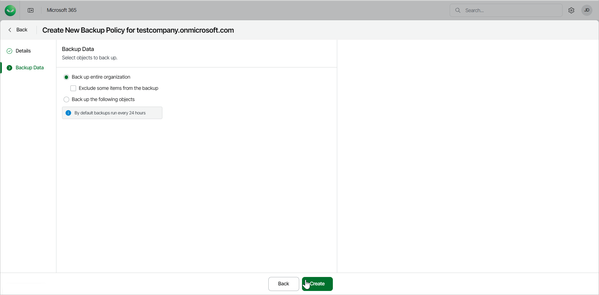 Step 4. Finish Working with Wizard After you select what objects to back up, click Create to create the new backup policy.