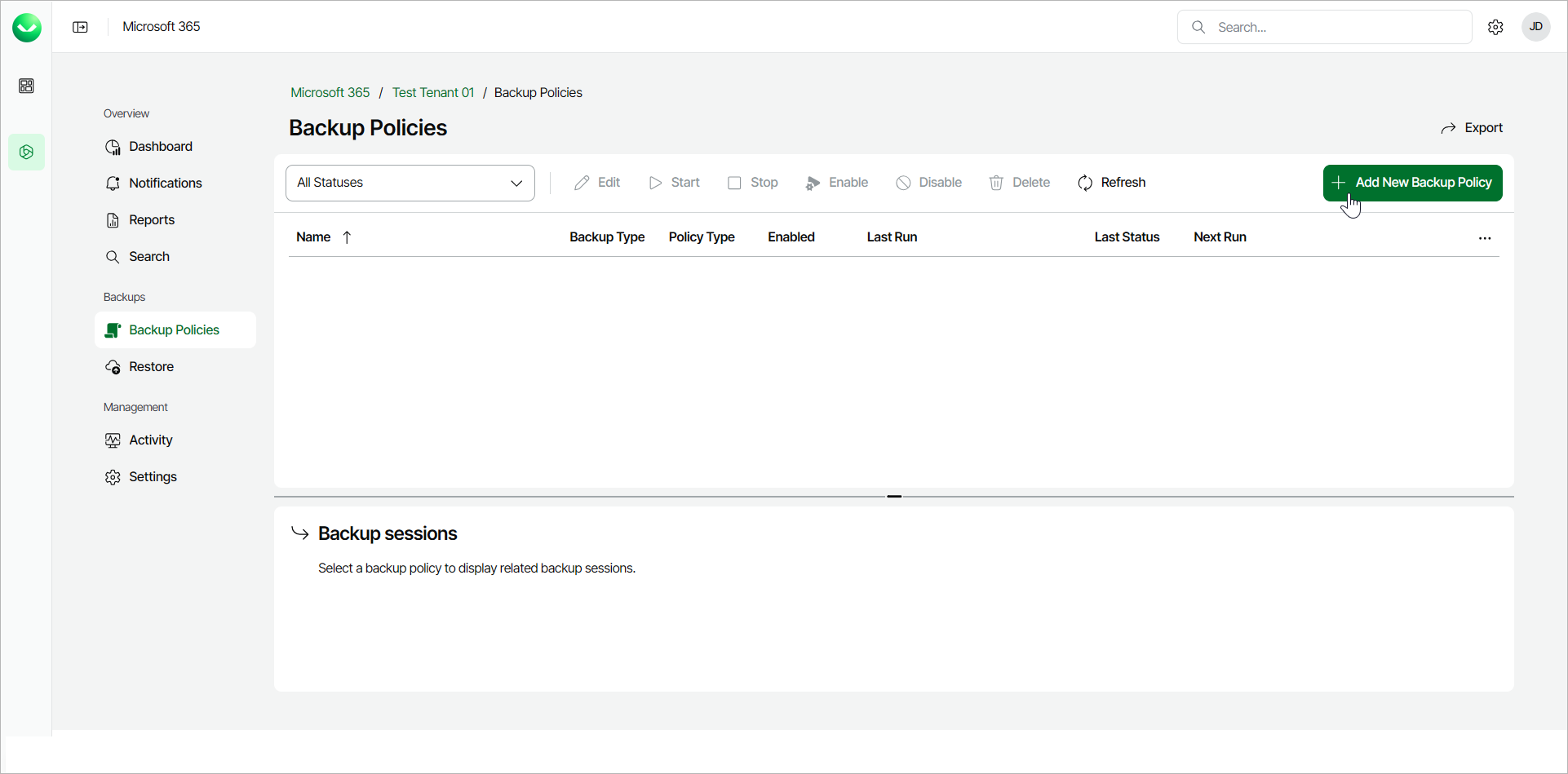 Step 1. Launch New Backup Policy Wizard To launch the New Backup Policy wizard, do the following:On the Microsoft 365 page, click the name of the tenant you want to manage.Select Backup Policies.On the Backup Policies page, click Add New Backup Policy.
