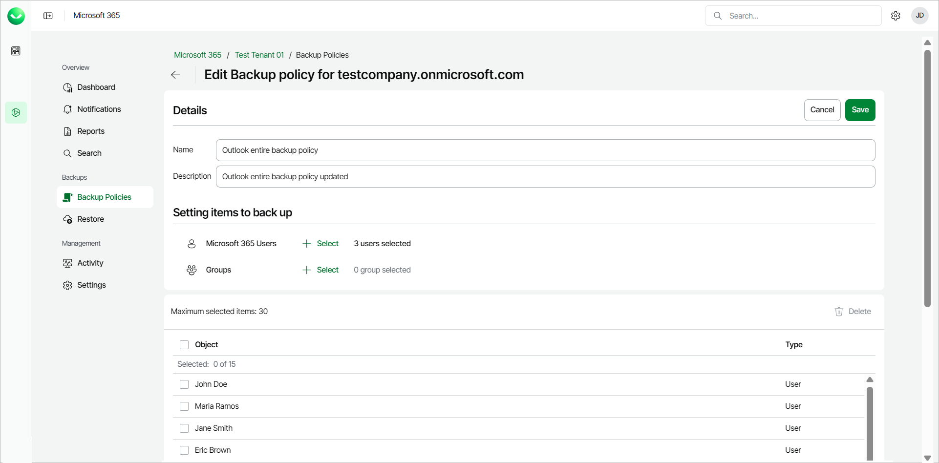 If you back up the entire organization, when the backup policy runs, it checks the entire content of the organization and the list of items to back up are automatically updated. For example, if some mailboxes were added or deleted from the organization between backup policy runs, the backup policy reflects those changes. For this reason, you cannot edit items in an entire organization backup policy. You can only edit the name and description of the backup policy. If you want to be able to add or remove items, you must delete the entire organization backup policy and create a selected items backup policy.