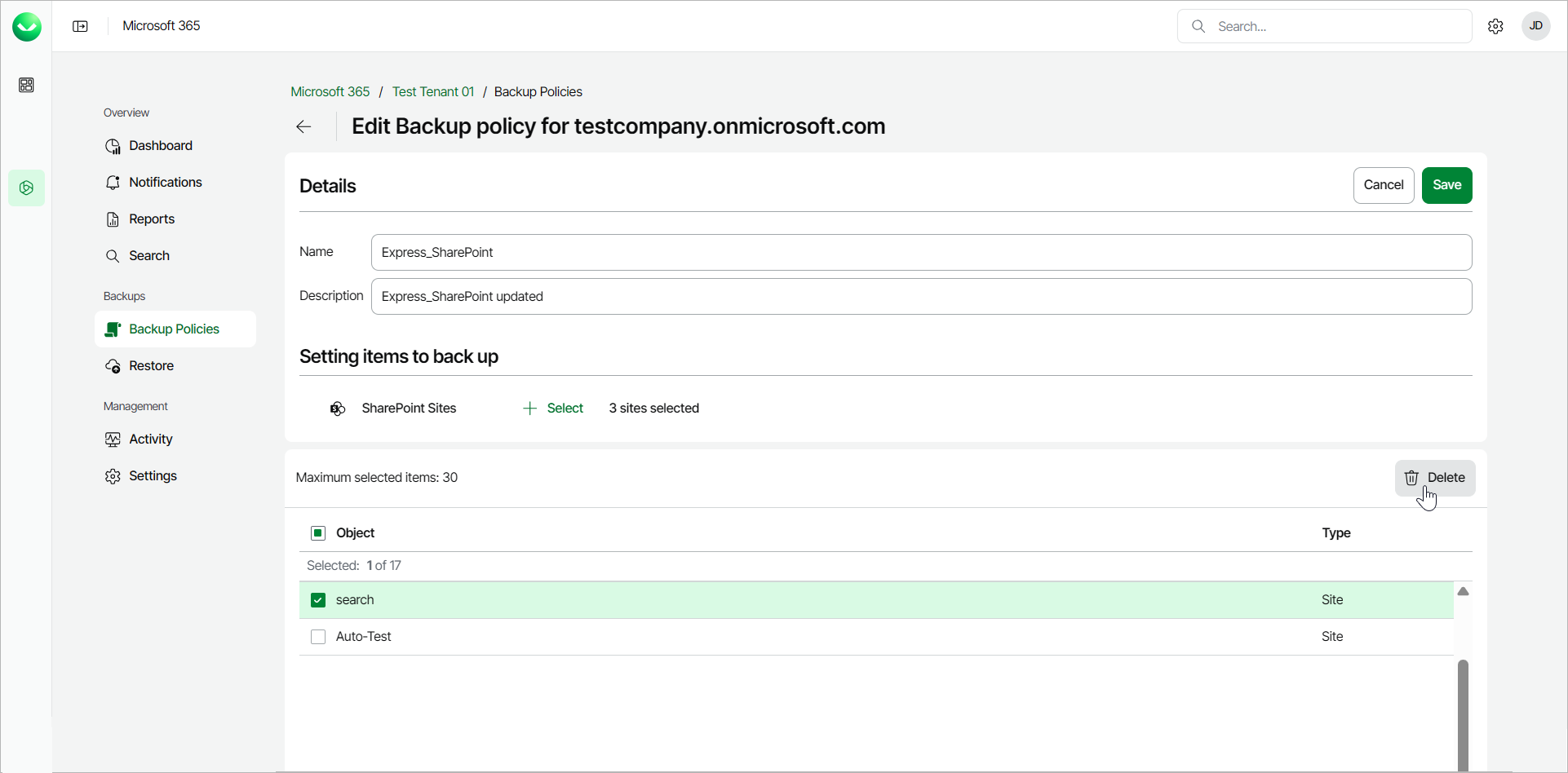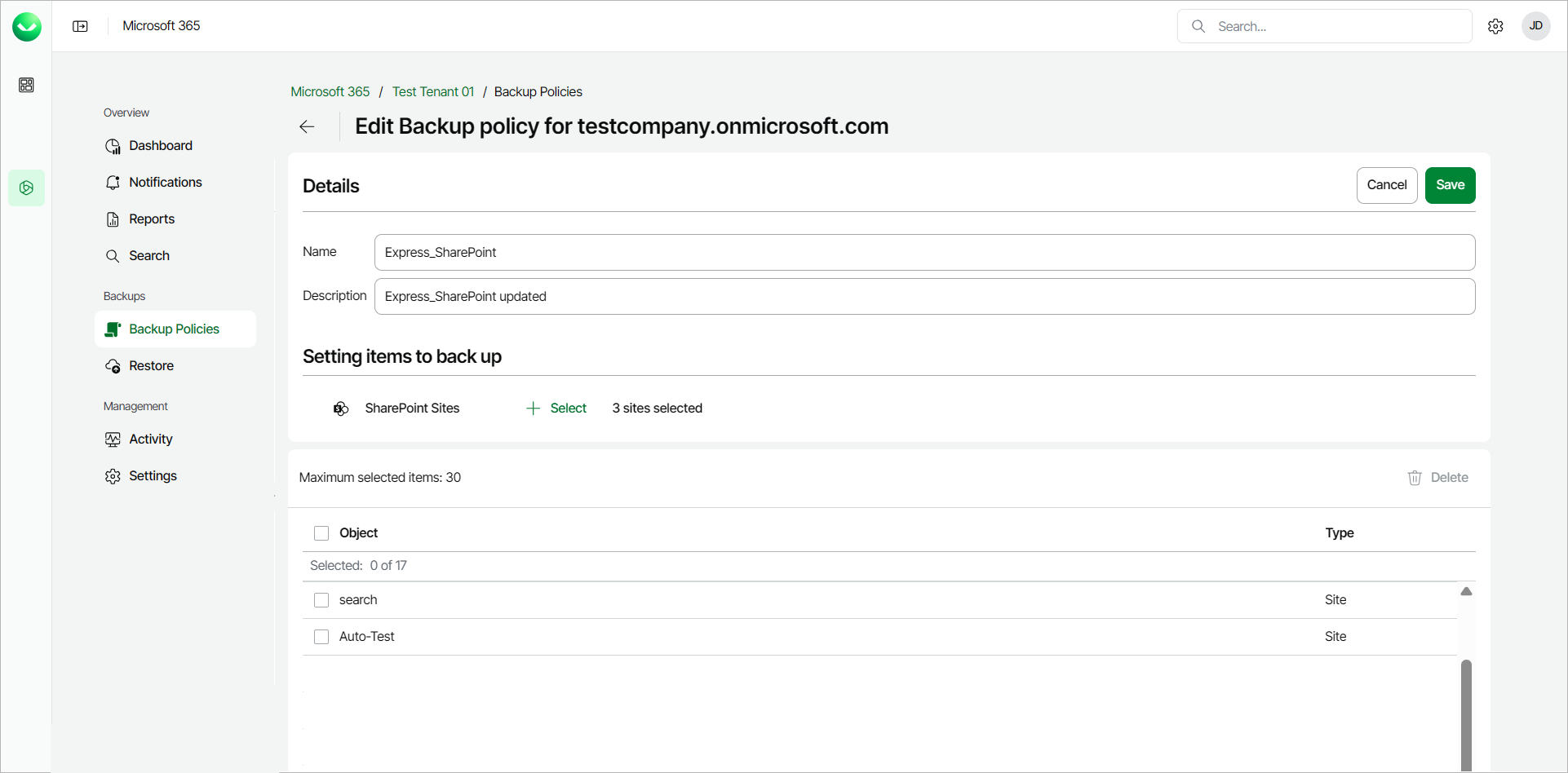 In contrast, a selected items backup policy only backs up the items you specify. New items are not automatically added between backup policy runs. You need to keep track of what you want to back up and edit the list of objects added to such policies. You can also edit the name and description of the backup policy.