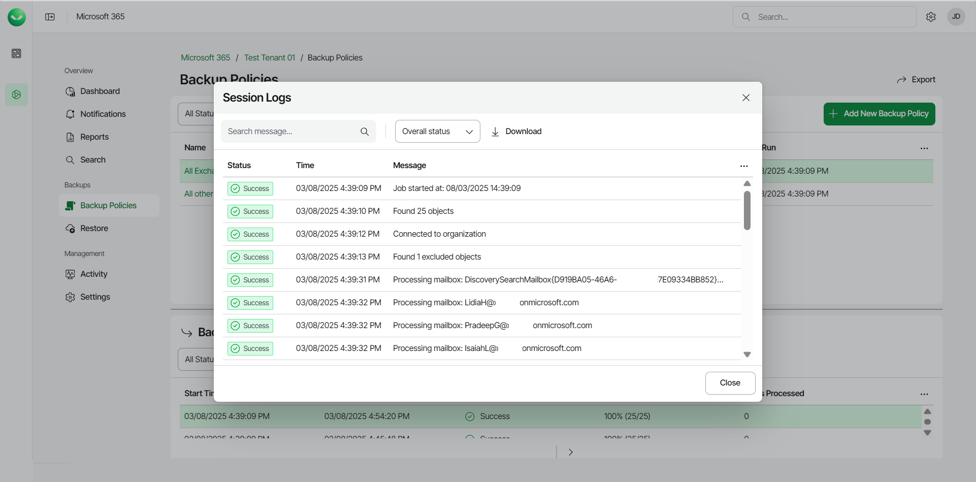 Veeam Data Cloud for Microsoft 365 allows you to view and download backup logs with information about your backup policies status, log messages and timestamps.