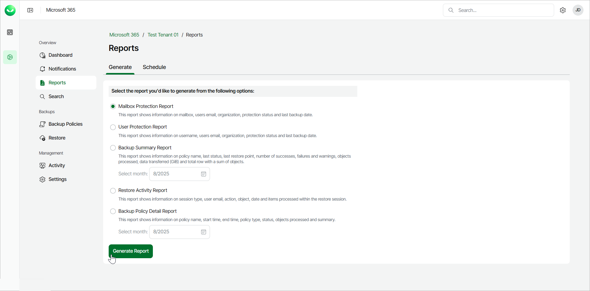 - For Mailbox Protection Report and User Protection Report, Veeam Data Cloud for Microsoft 365 will display the The report is being generated and you will be notified once it is complete message.