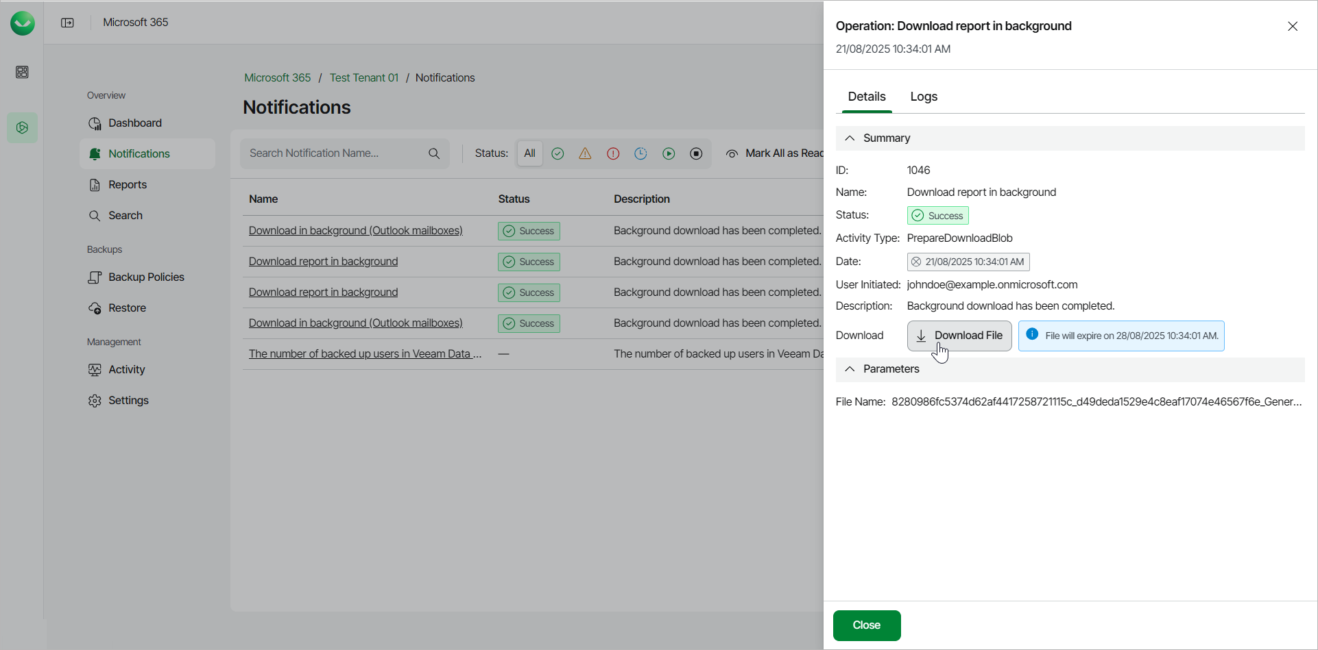 - The User field shows the email of the Veeam Data Cloud for Microsoft 365 user who performed the restore activity.