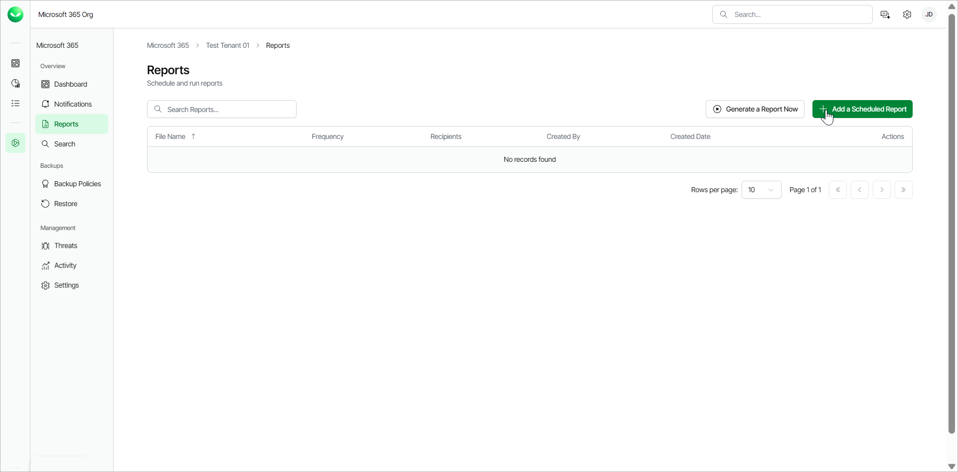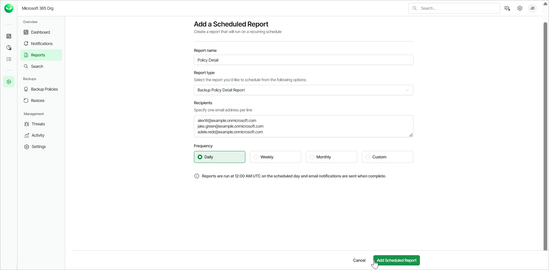 You can schedule reports in Veeam Data Cloud for Microsoft 365. When you schedule a report, you specify the frequency and email recipients. Once a scheduled report runs, the recipients receive an email from Veeam Data Cloud for Microsoft 365 with a link to download the report. The report is valid for 7 days.