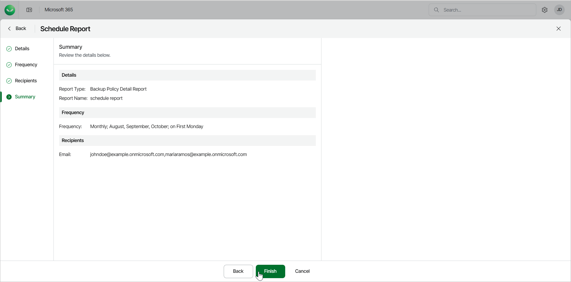 Step 5. Finish Working with Wizard At the Summary step of the wizard, review your settings and click Finish to enable the new scheduled report.