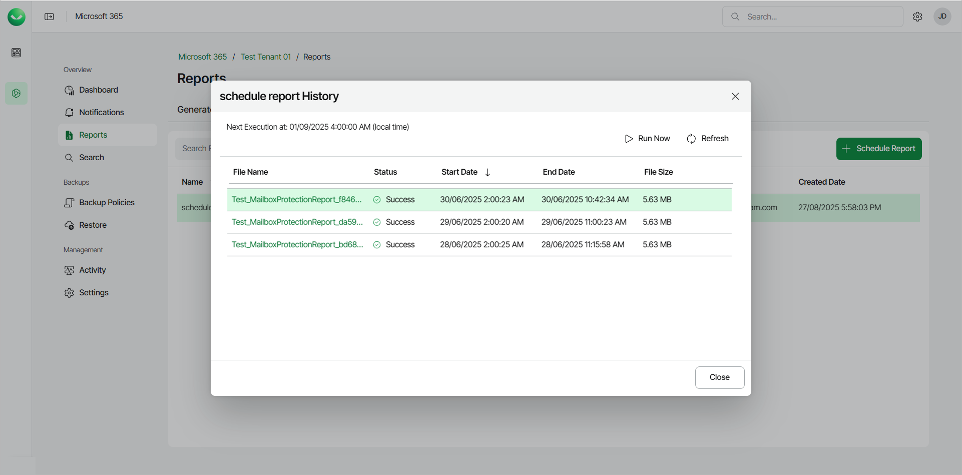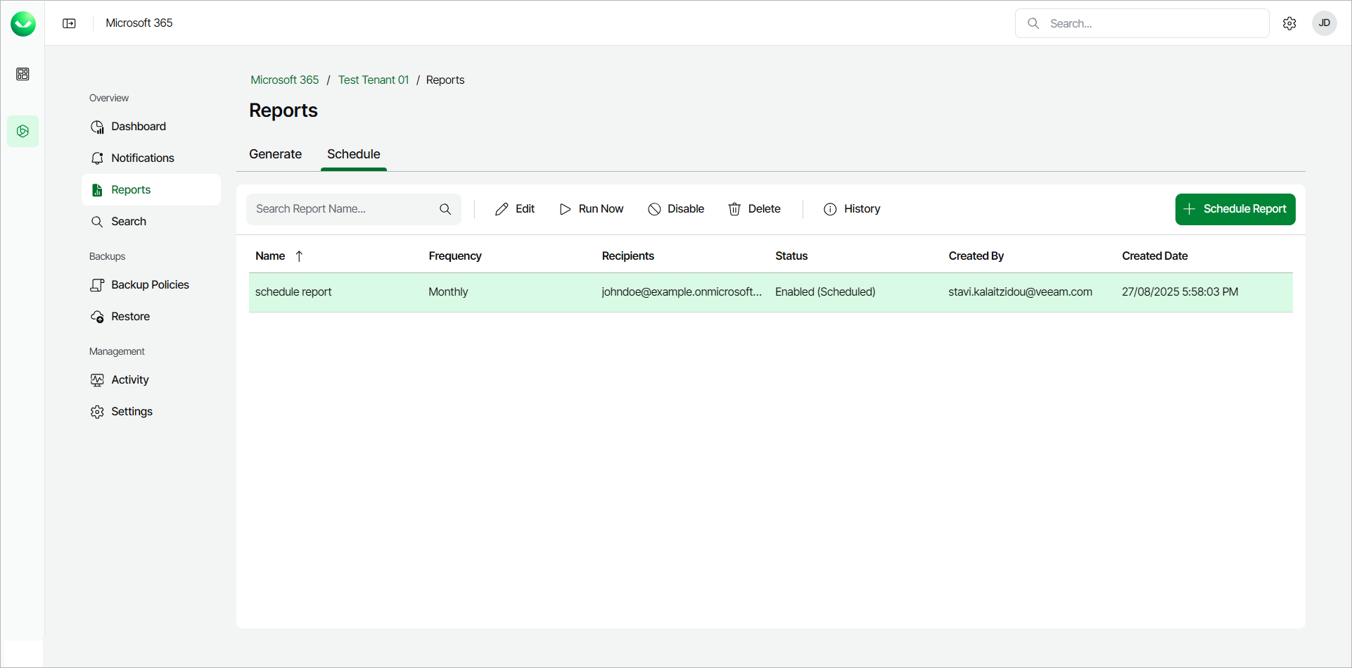 In Reports, in the Schedule tab, you can see a list of all the scheduled reports with information about the name, frequency, recipients, status, who created the report, and the date it was created.