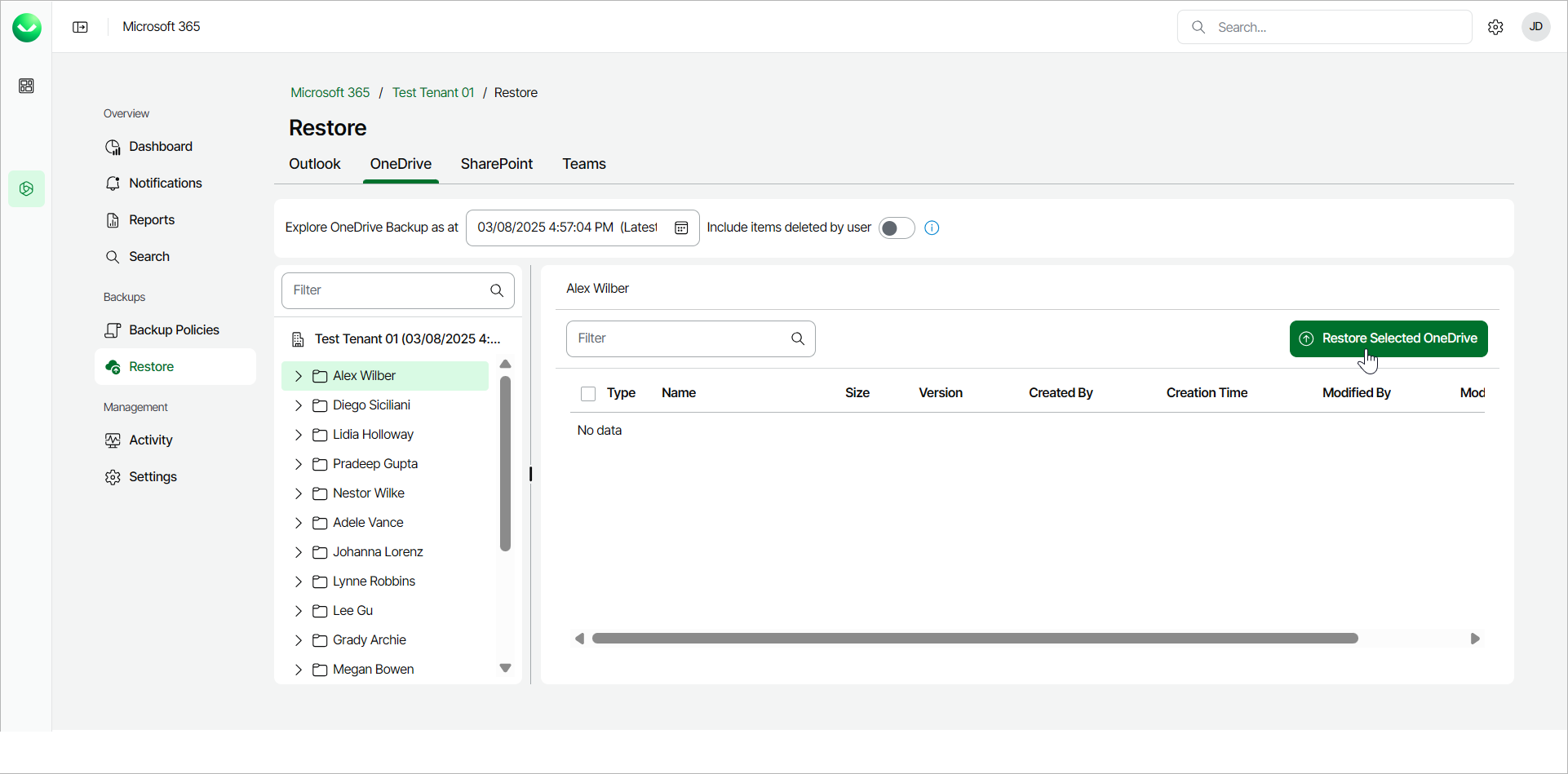 - On the OneDrive tab, select the user whose OneDrive you want to restore.