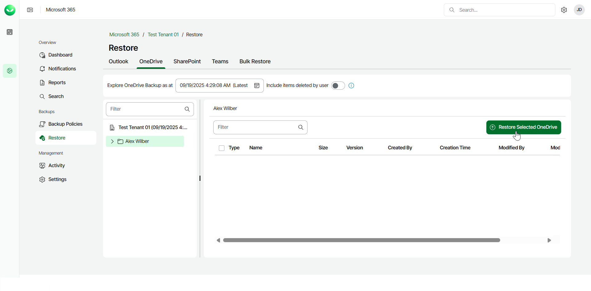 To restore an entire OneDrive from the backup: