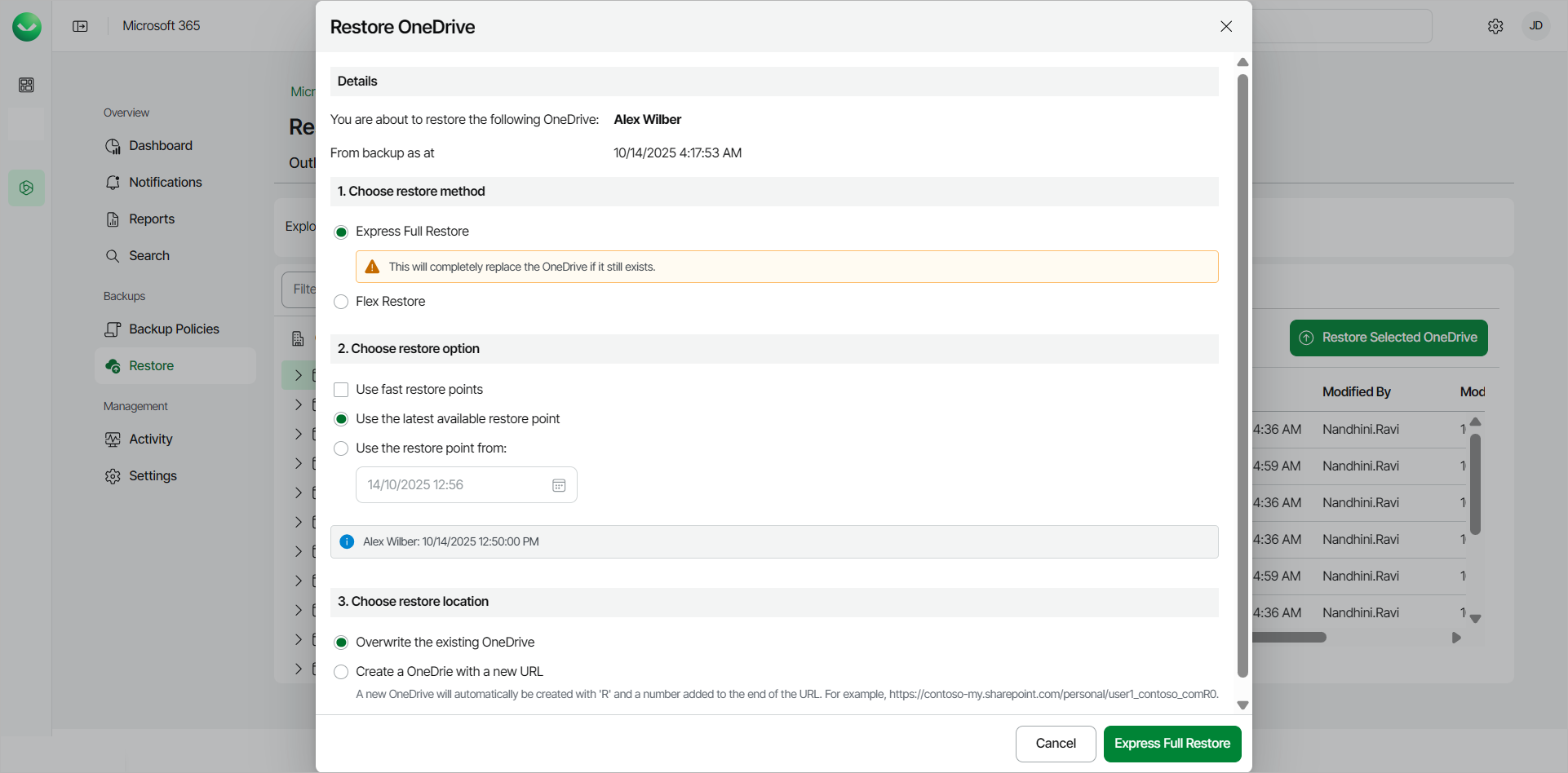- In the Restore OneDrive window, in the Choose restore method section, select Express Full Restore.