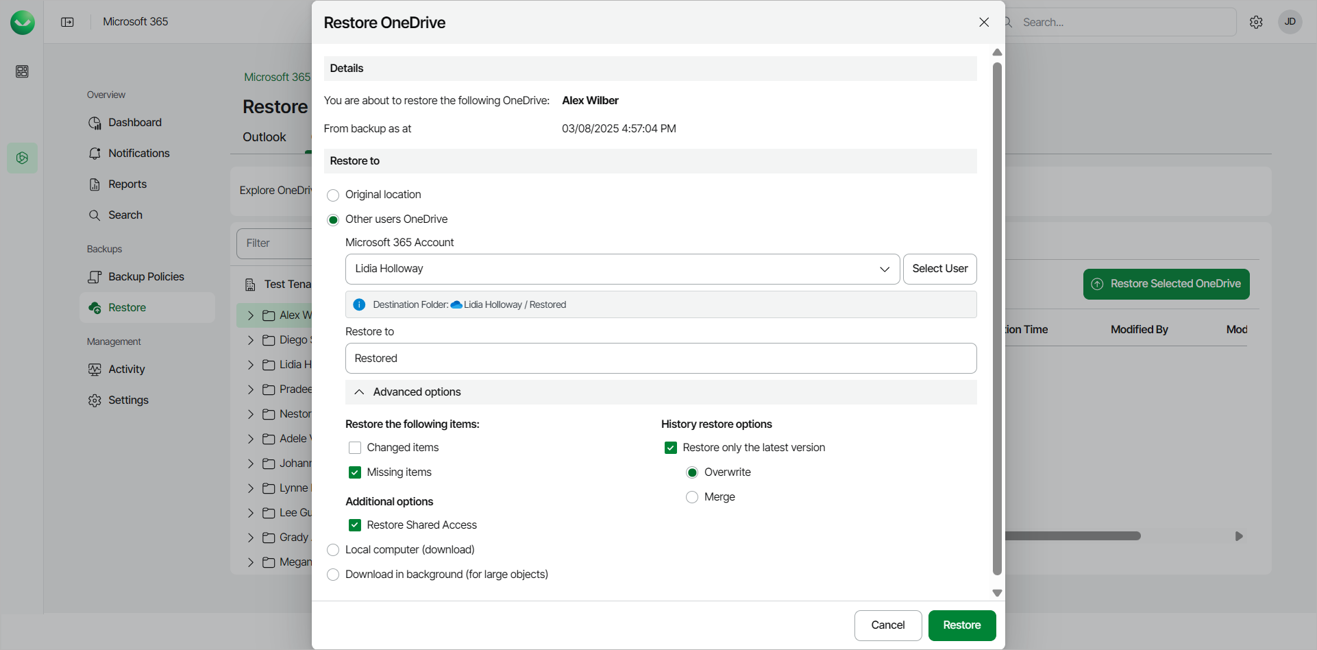 - Overwrite existing Onedrive. Select this option to replace data in the original location with the data from the backup.