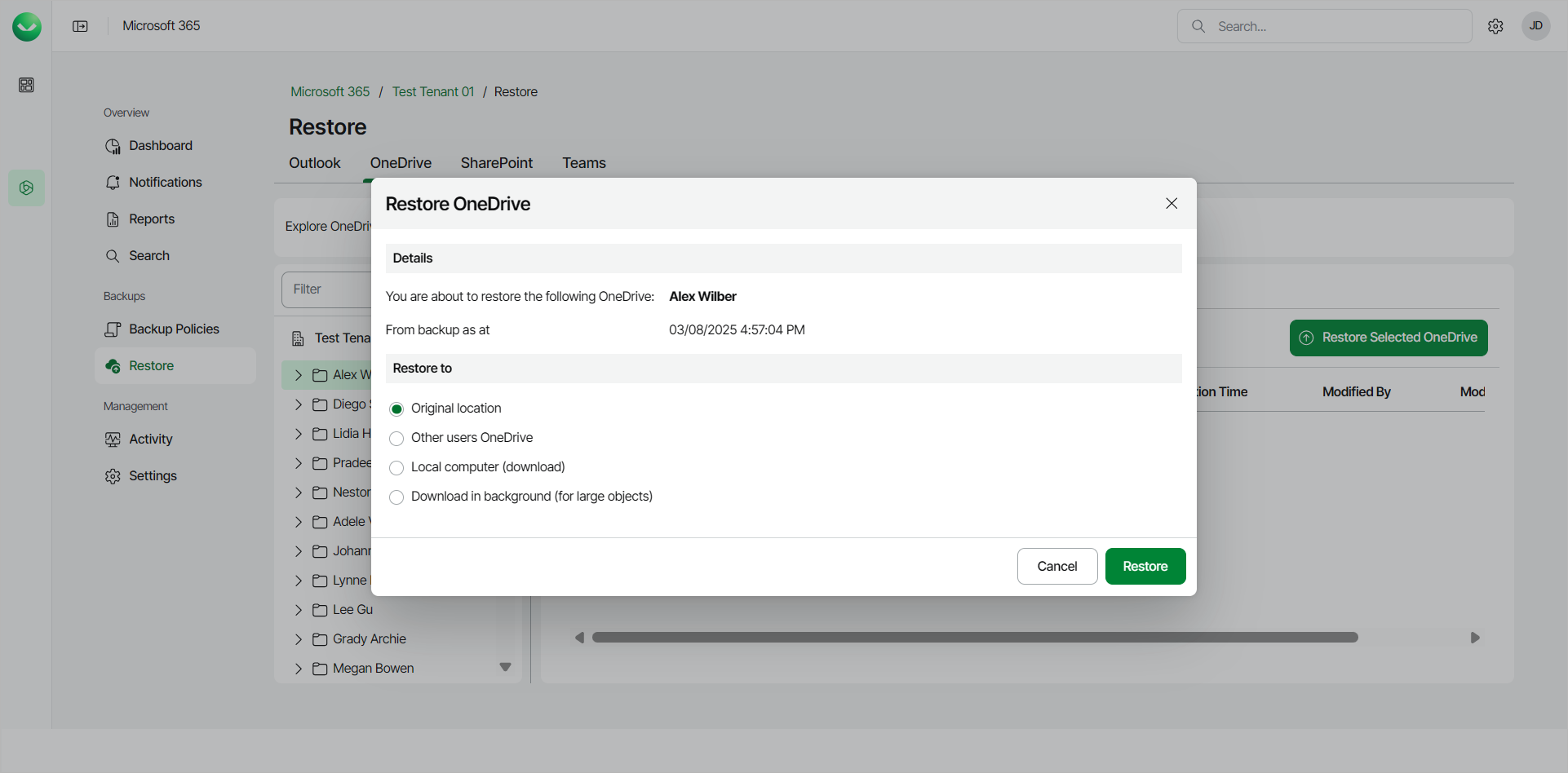 - Other users OneDrive. Select this option if you want to restore OneDrive to OneDrive of another Microsoft 365 user.