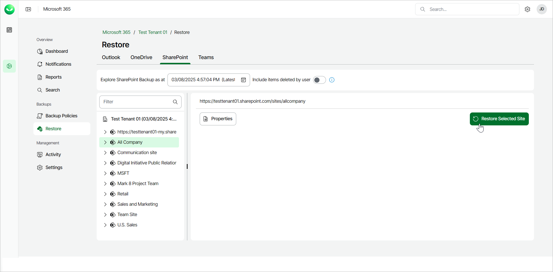 To restore multiple SharePoint sites, click on your organization and then select the check boxes next to the SharePoint sites you want to restore. You can restore multiple SharePoint sites only to the original location.