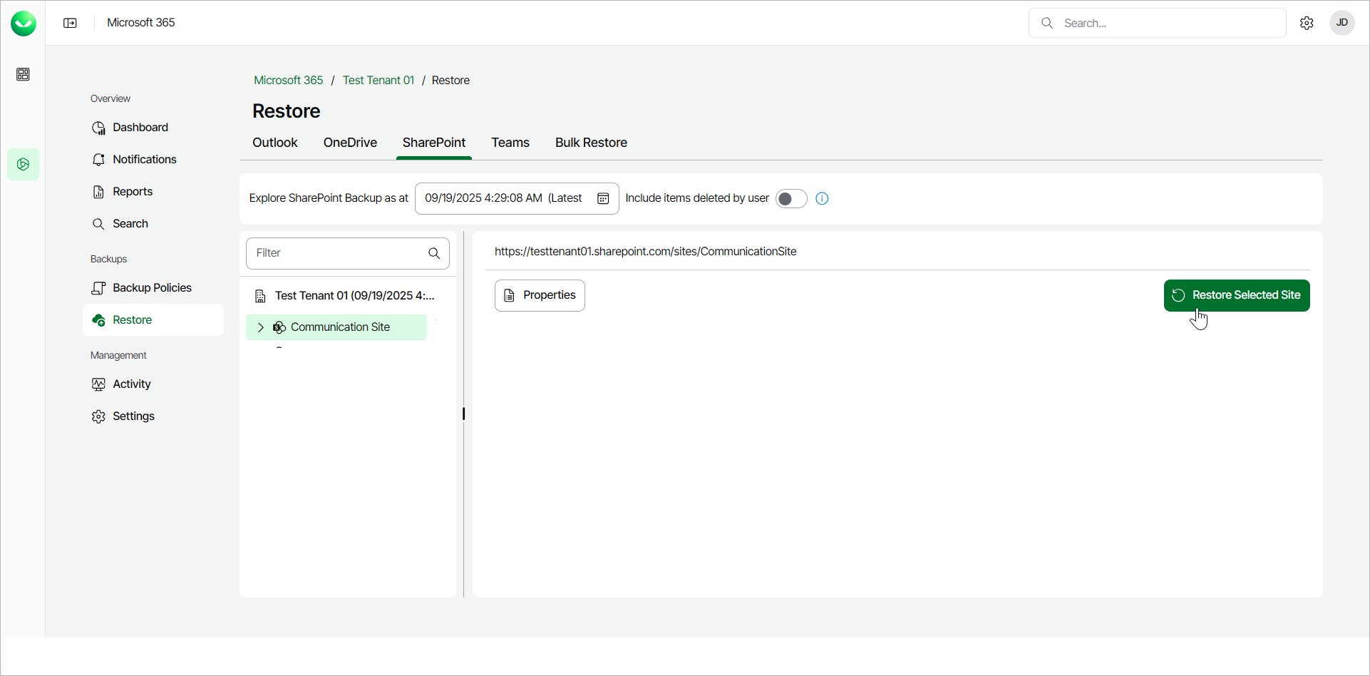 - Create a site with a new URL. Select this option to restore the data to a new location. Veeam Data Cloud restores the data to a newly created site with an R and a number added to the end of the URL. For example, https://contoso.sharepoint.com/sites/originalSiteR0.