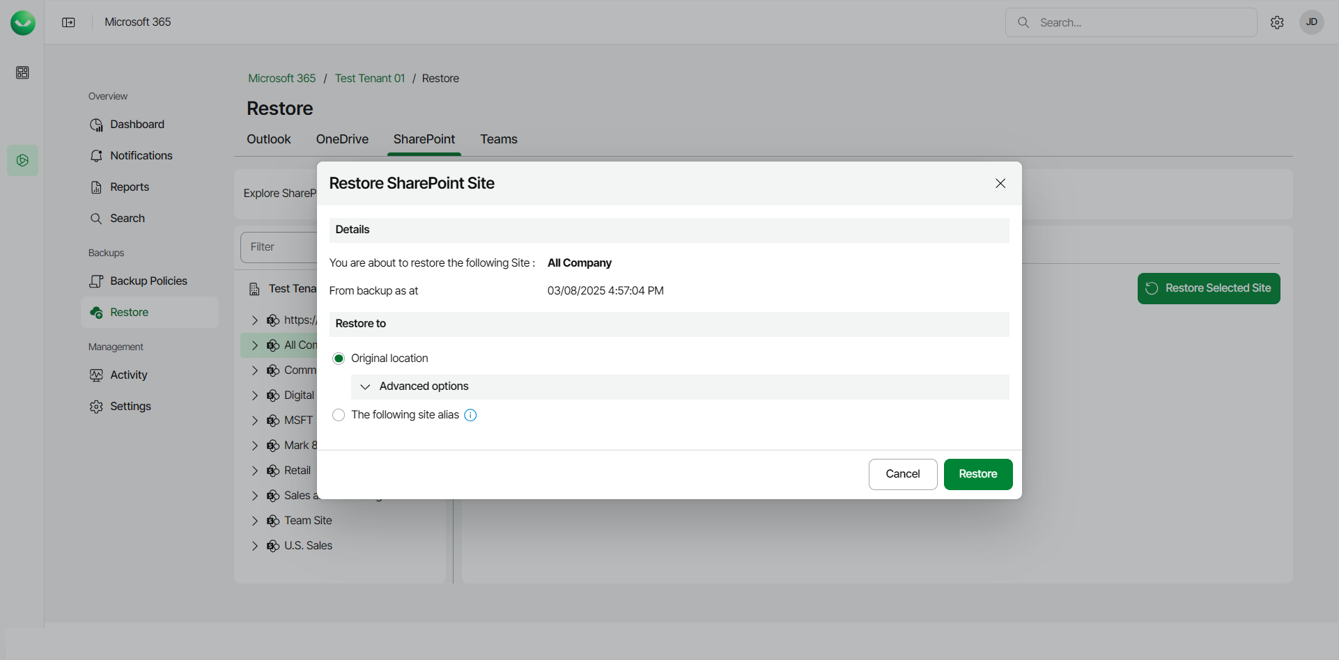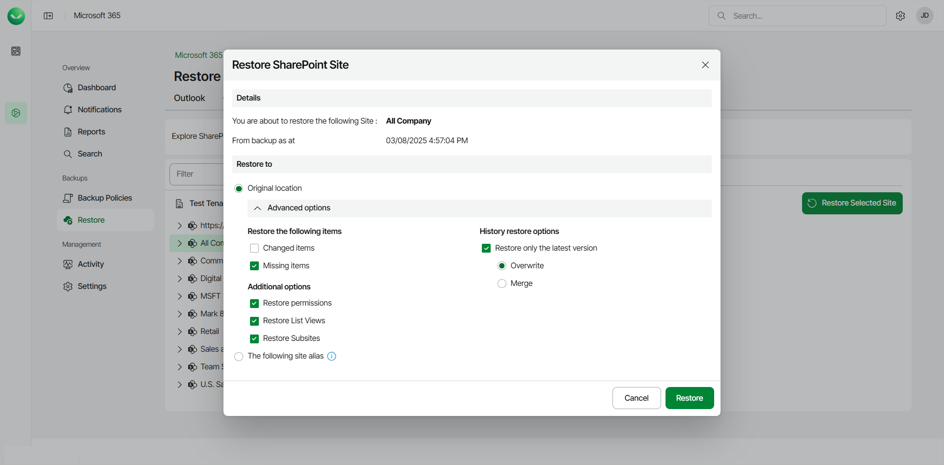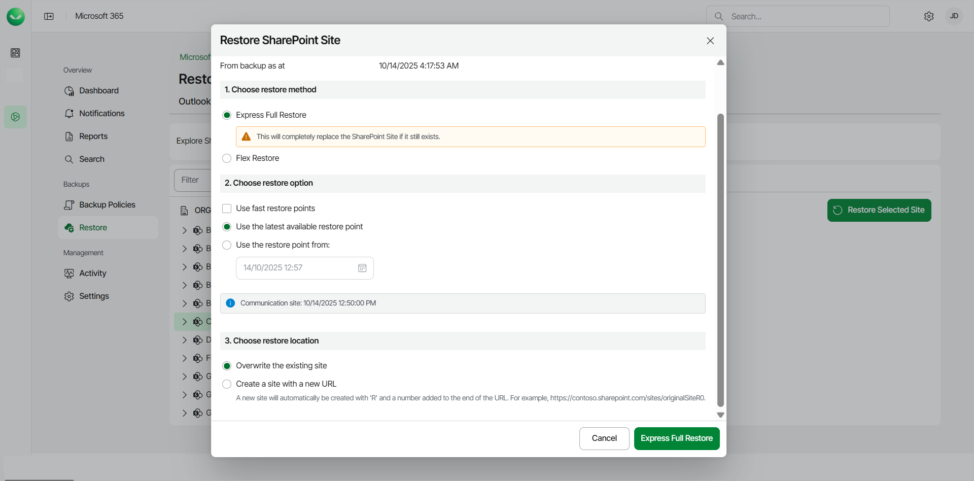 Veeam Data Cloud for Microsoft 365 offers 2 restore methods for restore of SharePoint sites: Flex Restore and Express Full Restore.