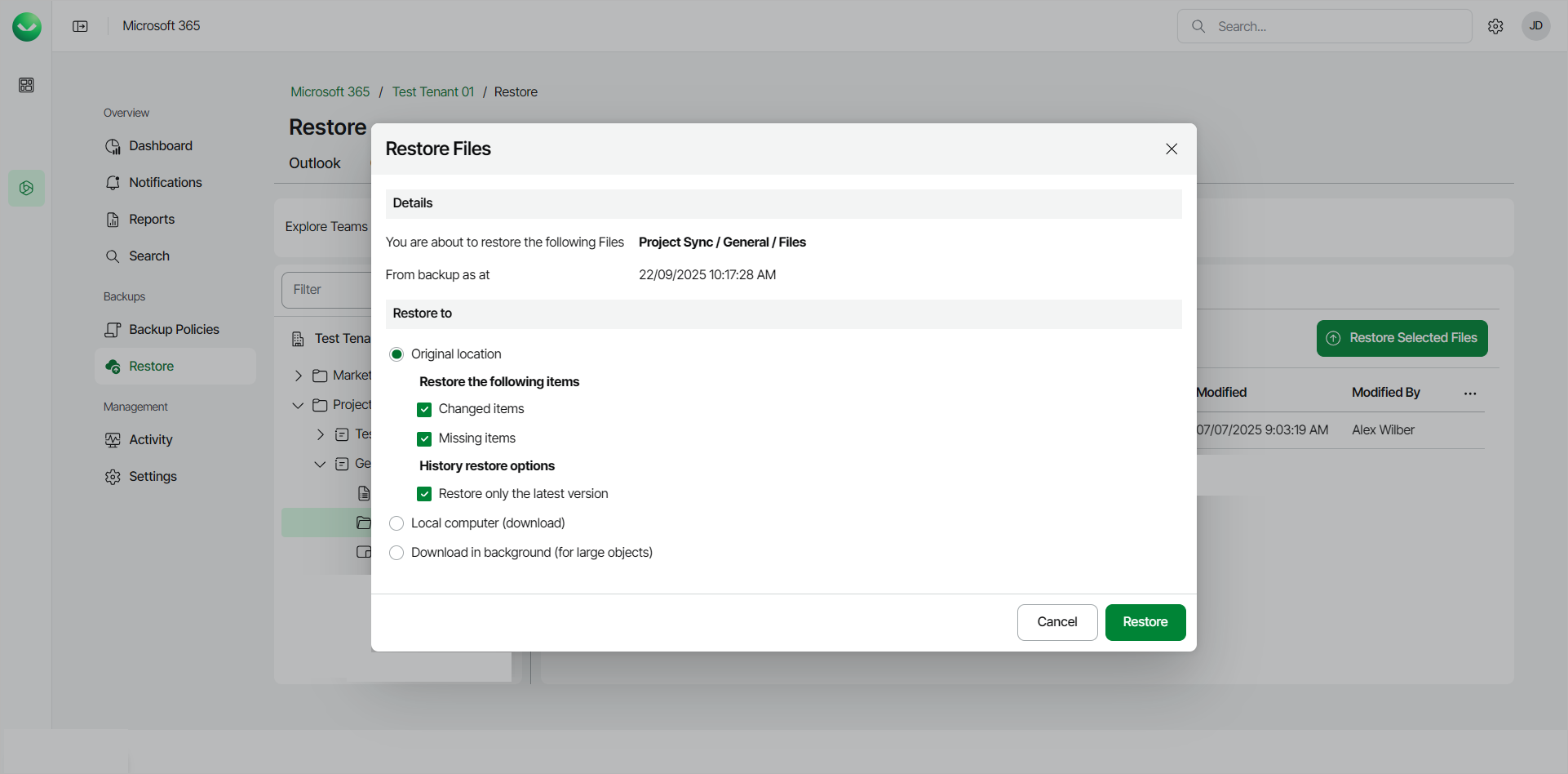 - In the Restore Files window, check the name of the team and channel whose files you want to restore, and the time when the backup was created.