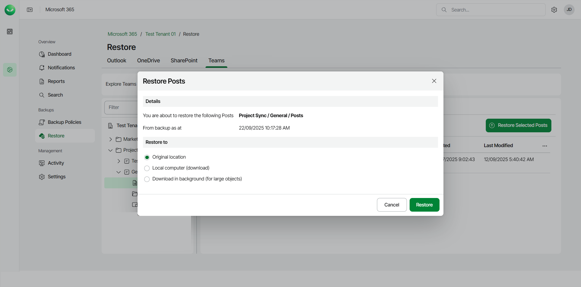 - In the Restore Posts window, check the name of the team and channel whose posts you want to restore, and the time when the backup was created.