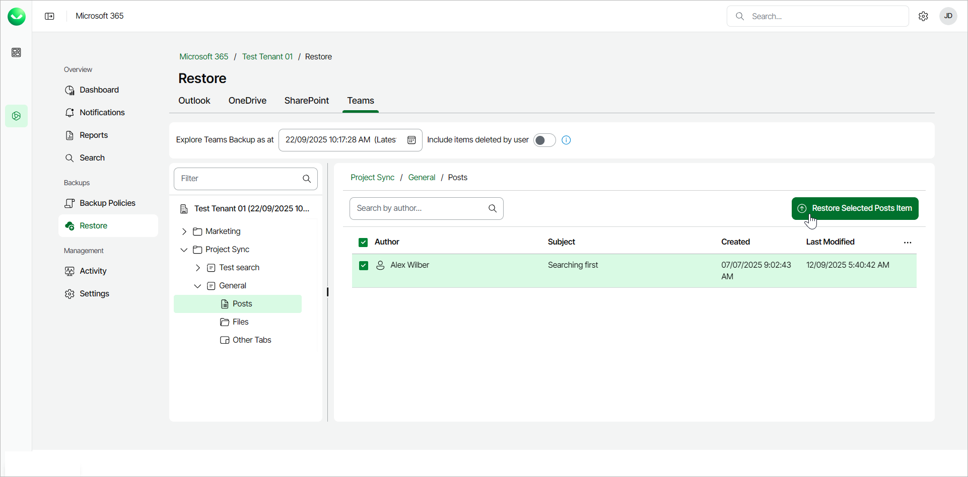 If team chats backup is not enabled for the organization, the backup does not contain team posts, and no posts are available for restore when you select the Posts node on the Teams Restore tab.