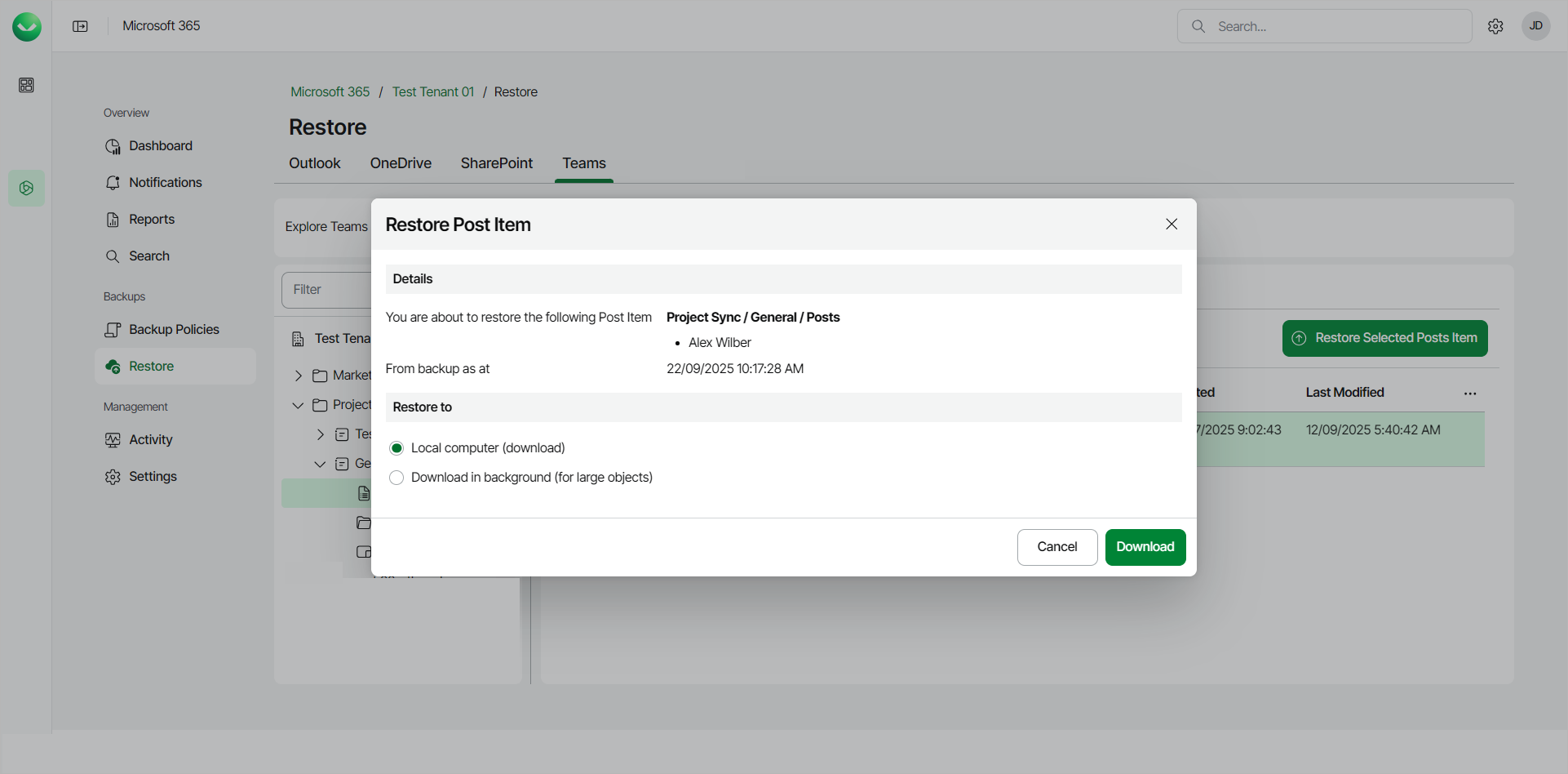 - Download in background. Select this option if you want to download the item to your computer. Use this option for items whose total size exceeds 1 GB or if the download process takes more than 3.5 minutes. Veeam Data Cloud for Microsoft 365 will save the posts to a .ZIP file. For more information on how to get the downloaded data, see Obtaining Downloaded Items.