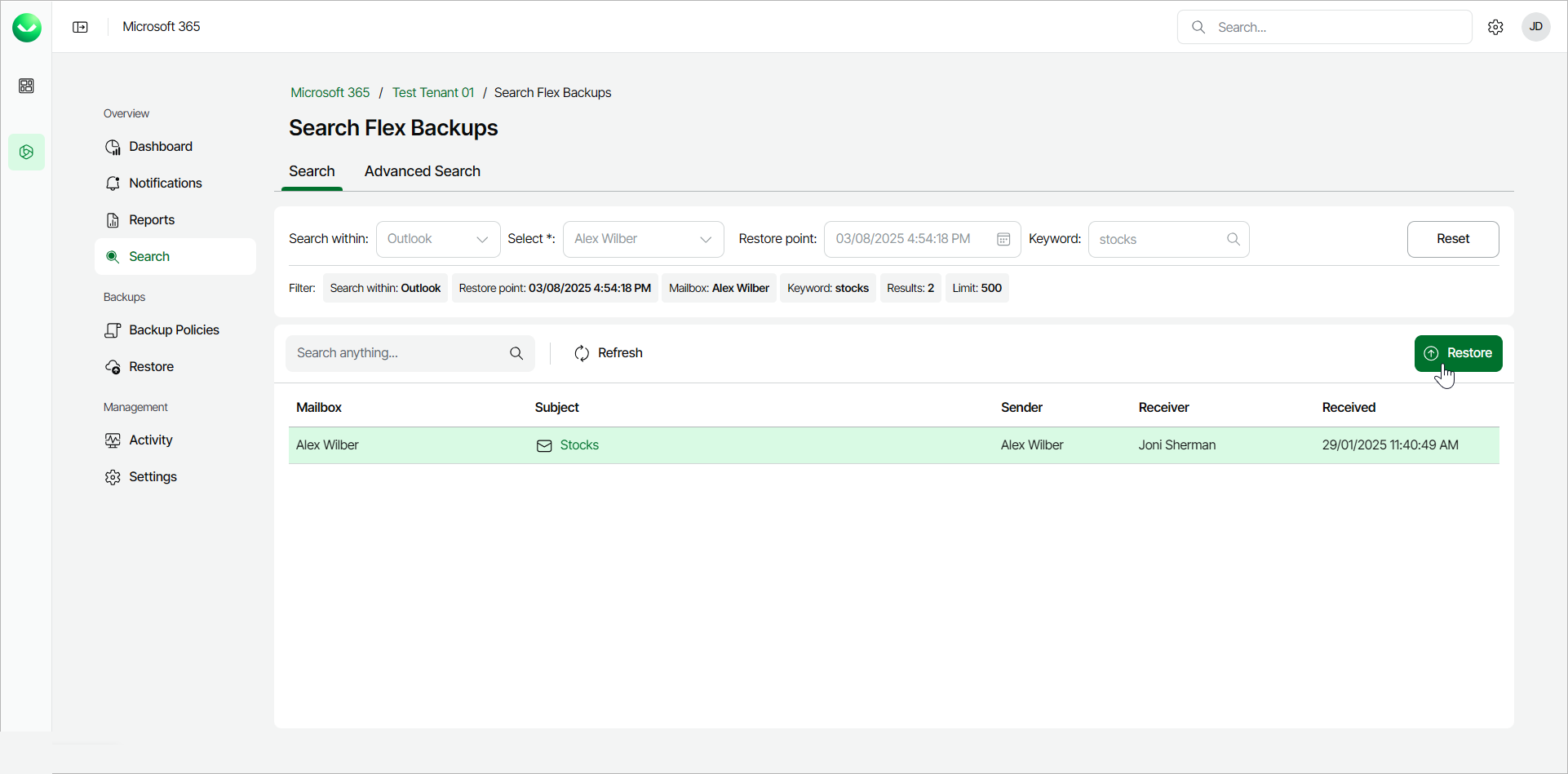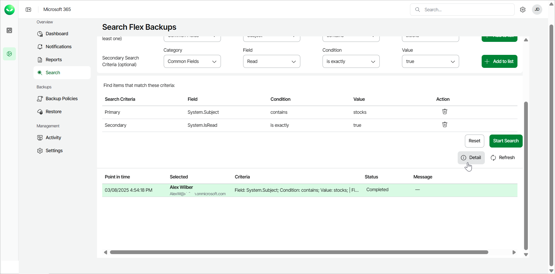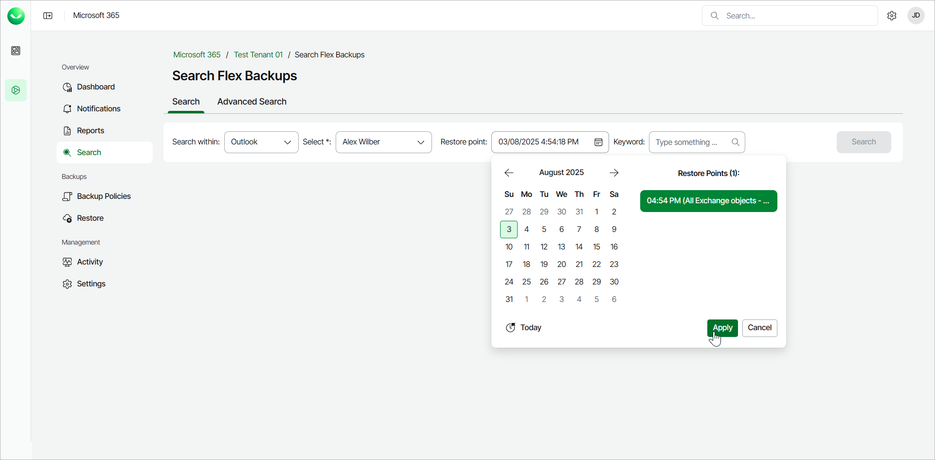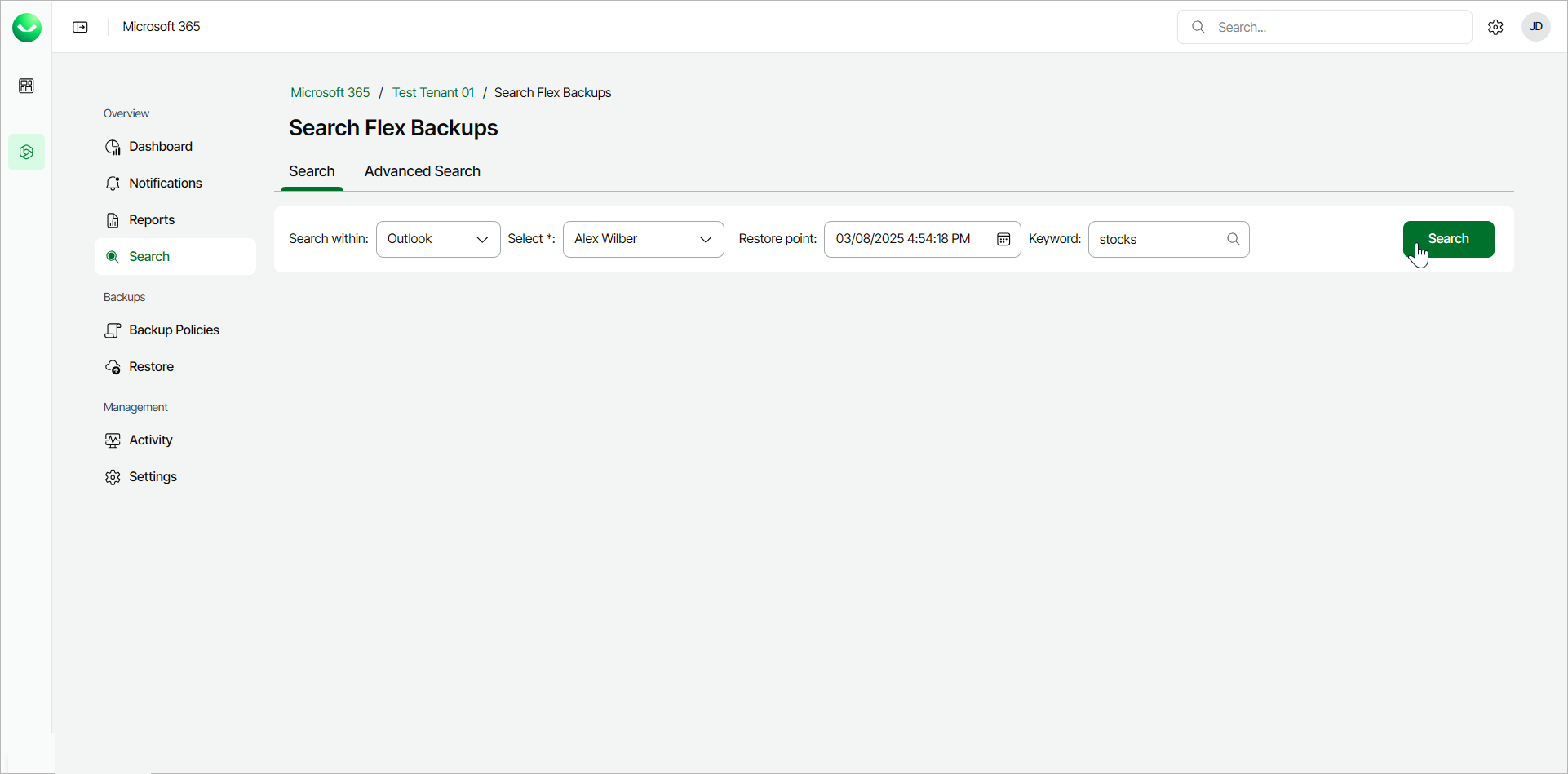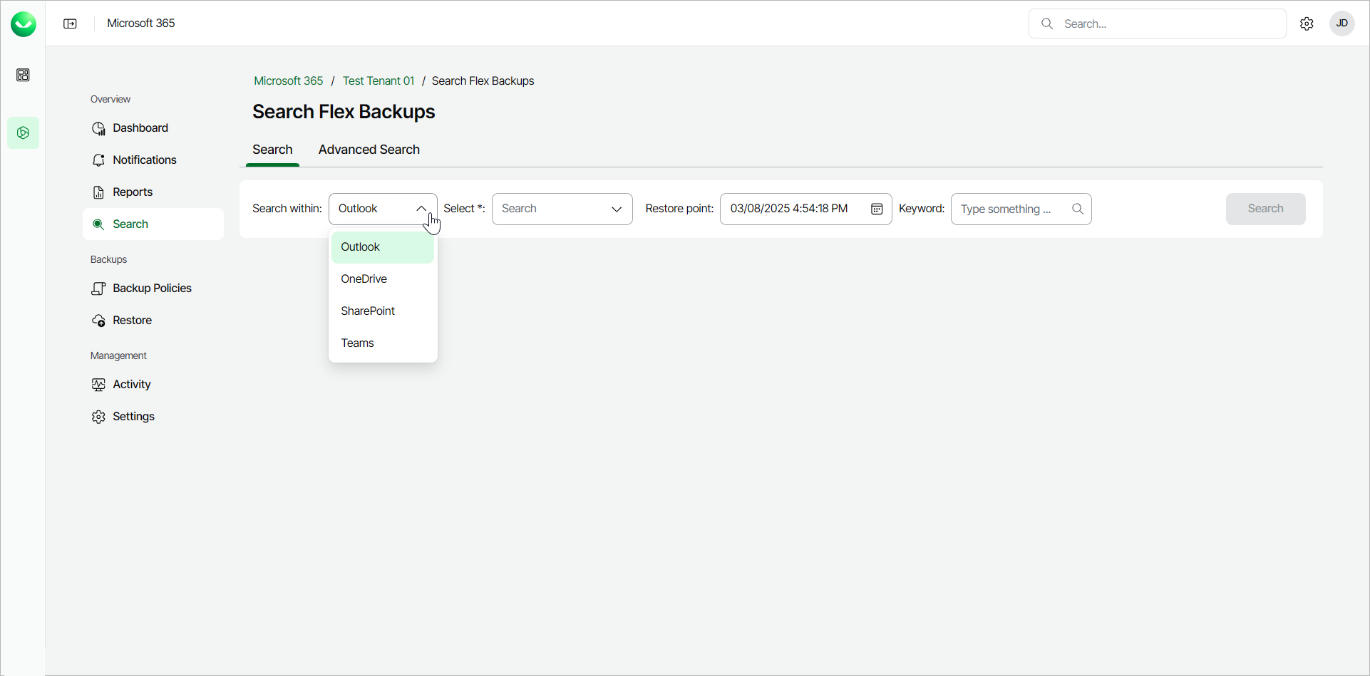 - Search. This is basic search, available for Microsoft Exchange Online, SharePoint Online documents, OneDrive for Business documents and Teams posts backups. You can select a restore point, specify a search word and get results fast.