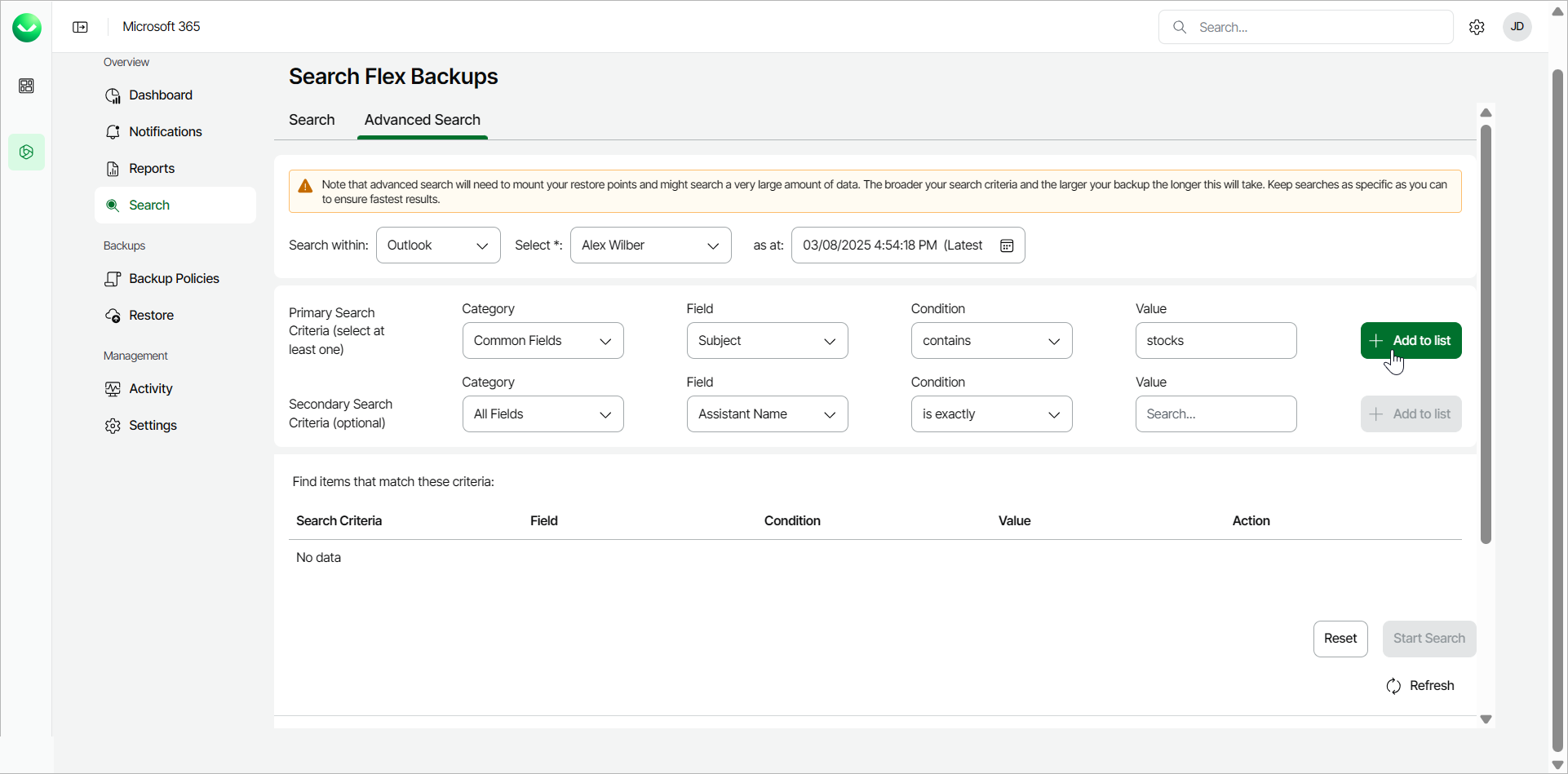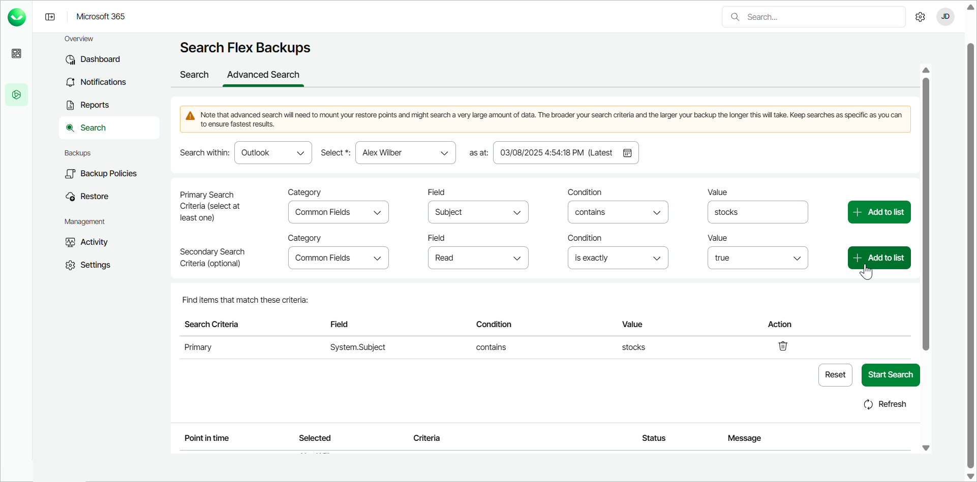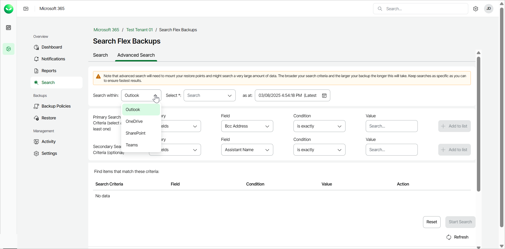 - Advanced Search. This is advanced search, available for Microsoft Exchange Online, OneDrive for Business, SharePoint Online and Teams backups. You can select a restore point and specify multiple search criteria. It may take a long time to display results.